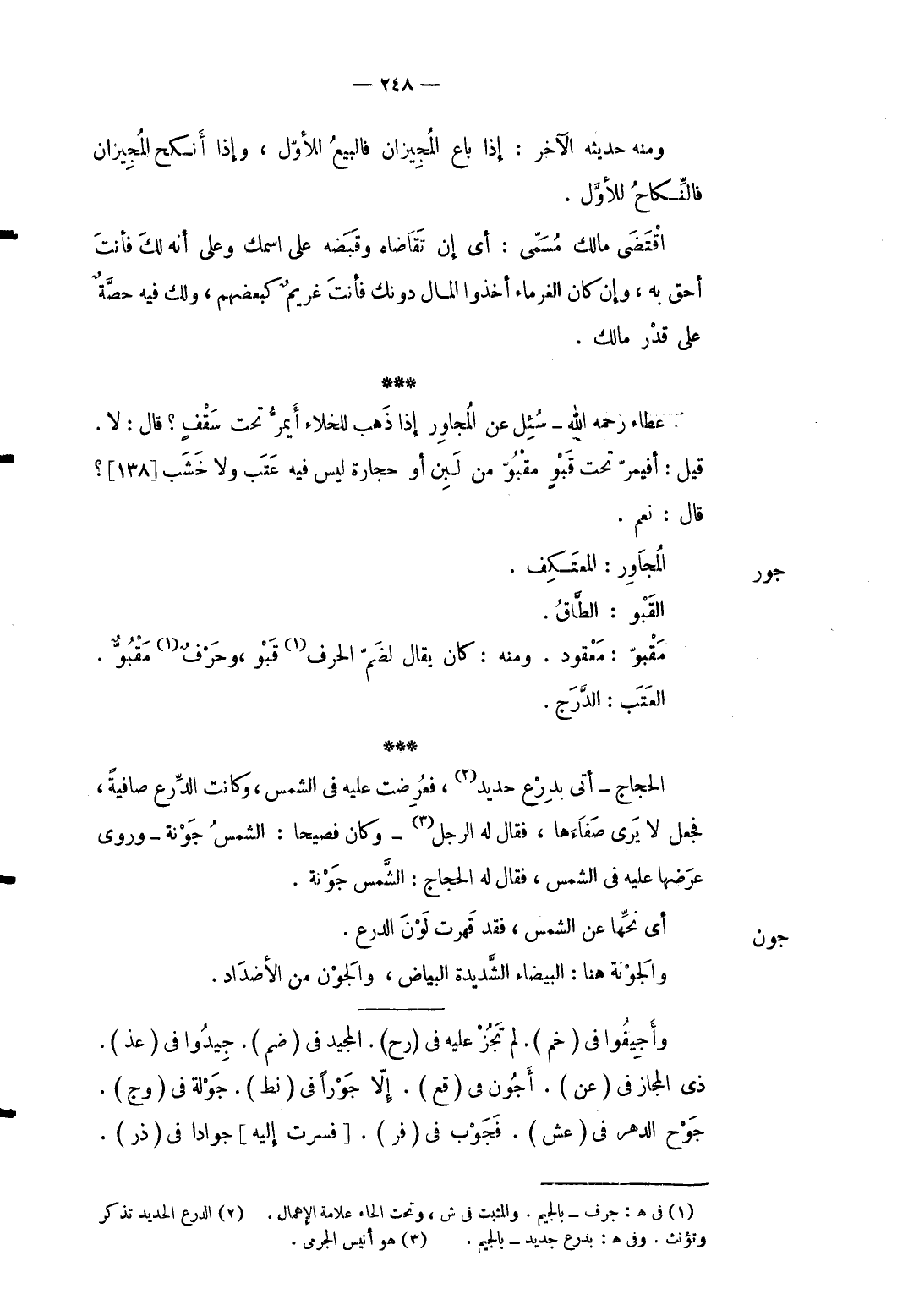 جور المجاور: الْمُعْتَكف. القبو: الطاق. مقبو: مَعْقُود. وَمِنْه: كَانَ يُقَال لضم الْحَرْف قبو وحرف مقبو. العتب: الدرج. الْحجَّاج أَتَى بدرع حَدِيد فعُرضت عَلَيْهِ فِي الشَّمْس وَكَانَت الدرْع صَافِيَة فَجعل لَا يرى صفاءها فَقَالَ لَهُ الرجل وَكَانَ فصيحا: الشَّمْس جونة. وروى عرضهَا عَلَيْهِ فِي الشَّمْس فَقَالَ لَهُ الْحجَّاج: الشَّمْس جونة.