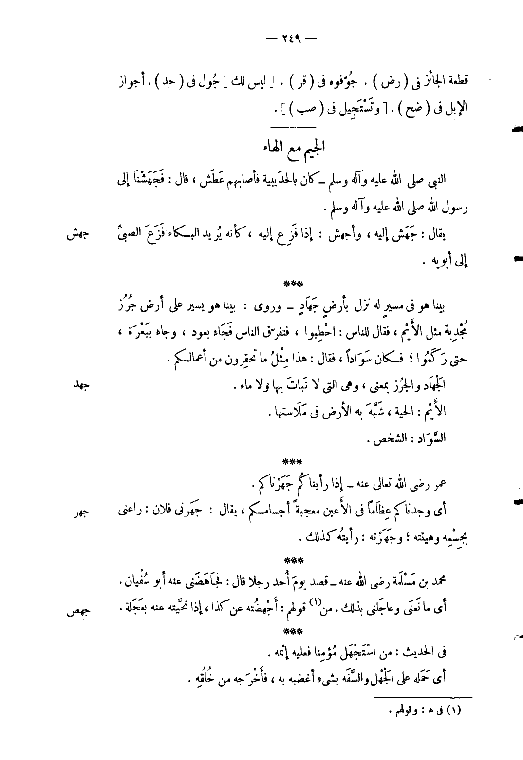 جهد الْجِهَاد والجرز بِمَعْنى وَهِي الَّتِي لَا نَبَات بهَا وَلَا مَاء. الأيم: الْحَيَّة شبه بِهِ الأَرْض فِي ملامستها. السوَاد: السخص. عمر رَضِي الله تَعَالَى عَنهُ إِذا رأيناكم جهرناكم.