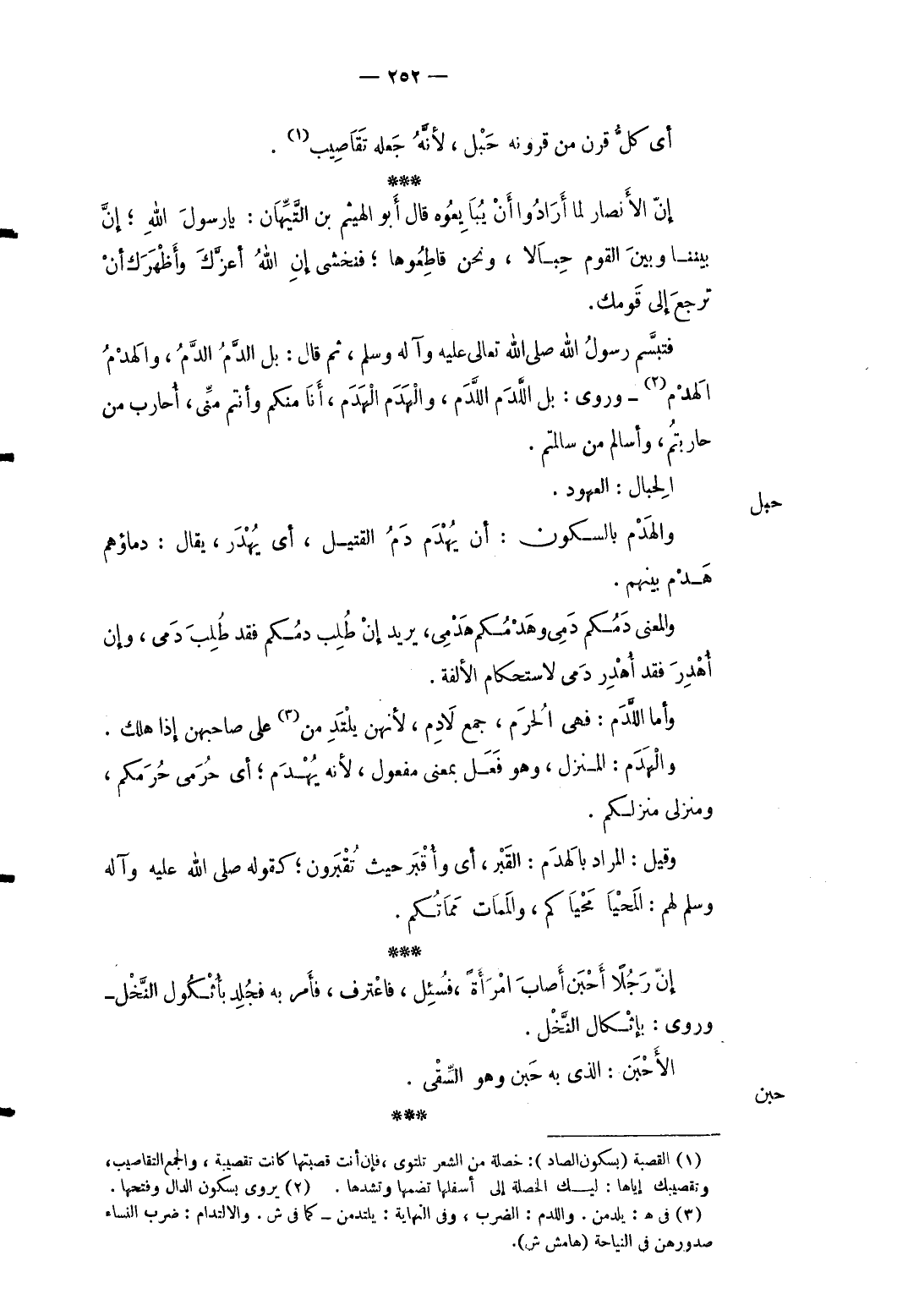 حَبل الحبال: العهود. وَالْهدم بِالسُّكُونِ: أَن يُهدم دم الْقَتِيل أَي يهدر يُقَال: دِمَاؤُهُمْ هدم بَينهم. وَالْمعْنَى دمكم دمي وهدمكم هدمي يُرِيد إِن طلب دمكم فقد طلب دمي وَإِن أُهدر فق أهْدر دمي لاستحكام الألفة. وَأما اللدم: فَهِيَ الْحرم جمع لادم لِأَنَّهُنَّ يلتد من على صاحبهن إِذا هلك. وَالْهدم: الْمنزل وَهُوَ فعل بمعى مفعول لِأَنَّهُ يهدم أَي حرمي حرمكم ومنزلي منزلكم. وَقيل: المُرَاد بالهدم: الْقَبْر أَي وأُقبر حَيْثُ تقبرون كَقَوْلِه صلى الله عَلَيْهِ وَسلم لَهُم: الْمحيا محياكم وَالْمَمَات مماتكم. إِن رجلا أحبن أصَاب امْرَأَة فسُئل فاعترف فَأمر بِهِ فجُلد بأُثكول النّخل. وروى: بإثكال النّخل.