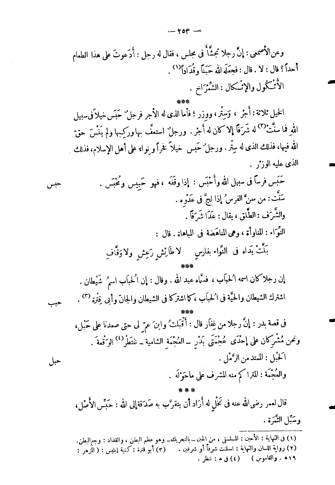 حبس حبس فرسا فِي سَبِيل الله وأحبس: إِذا وَقفه فَهُوَ حبيس ومُحبس. سنَّت: من سنّ الْفرس إِذا لج فِي عدوه. والشرف: الطلق يُقَال: عدا شرفاً. النواء: المناوأة وَهِي المناهضة فِي المباهاة. قَالَ: ... بَلَّتْ يَداه فِي النِّواء بفارسٍ ... لَا طَائِشٍ رَعِشٍ وَلَا وَقَّافِ ... إِن رجلا كَانَ اسْمه الْحباب: فَسَماهُ عبد الله. وَقَالَ: إِن الْحباب اسْم شَيْطَان.
