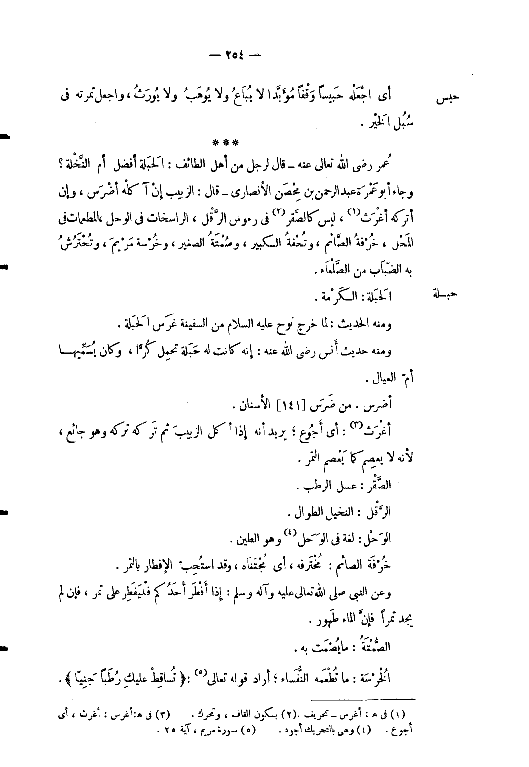 حبس أَي اجْعَلْهُ حَبِيسًا وَقفا مُؤَبَّدًا لَا يُبَاع وَلَا يُوهب وَلَا يُورث وَاجعَل ثَمَرَته فِي سبل الْخَيْر. عمر رَضِي الله تَعَالَى عَنهُ قَالَ لرجل من أهل الطَّائِف: الحبلة أفضل أم النَّخْلَة وَجَاء أَبُو عمْرَة عبد الرَّحْمَن بن مُحصن الْأنْصَارِيّ. قَالَ: الزَّبِيب إِن آكله أضرس وَإِن أتركه أغرث وَلَيْسَ كالصقر فِي رُءُوس الرقل الراسخات فِي الوحل المطعمات فِي الْمحل خرفة الصَّائِم وتحفة الْكَبِير وصمتة الصَّغِير وخرسة مَرْيَم وتحترش بِهِ الضباب من الصلعاء.