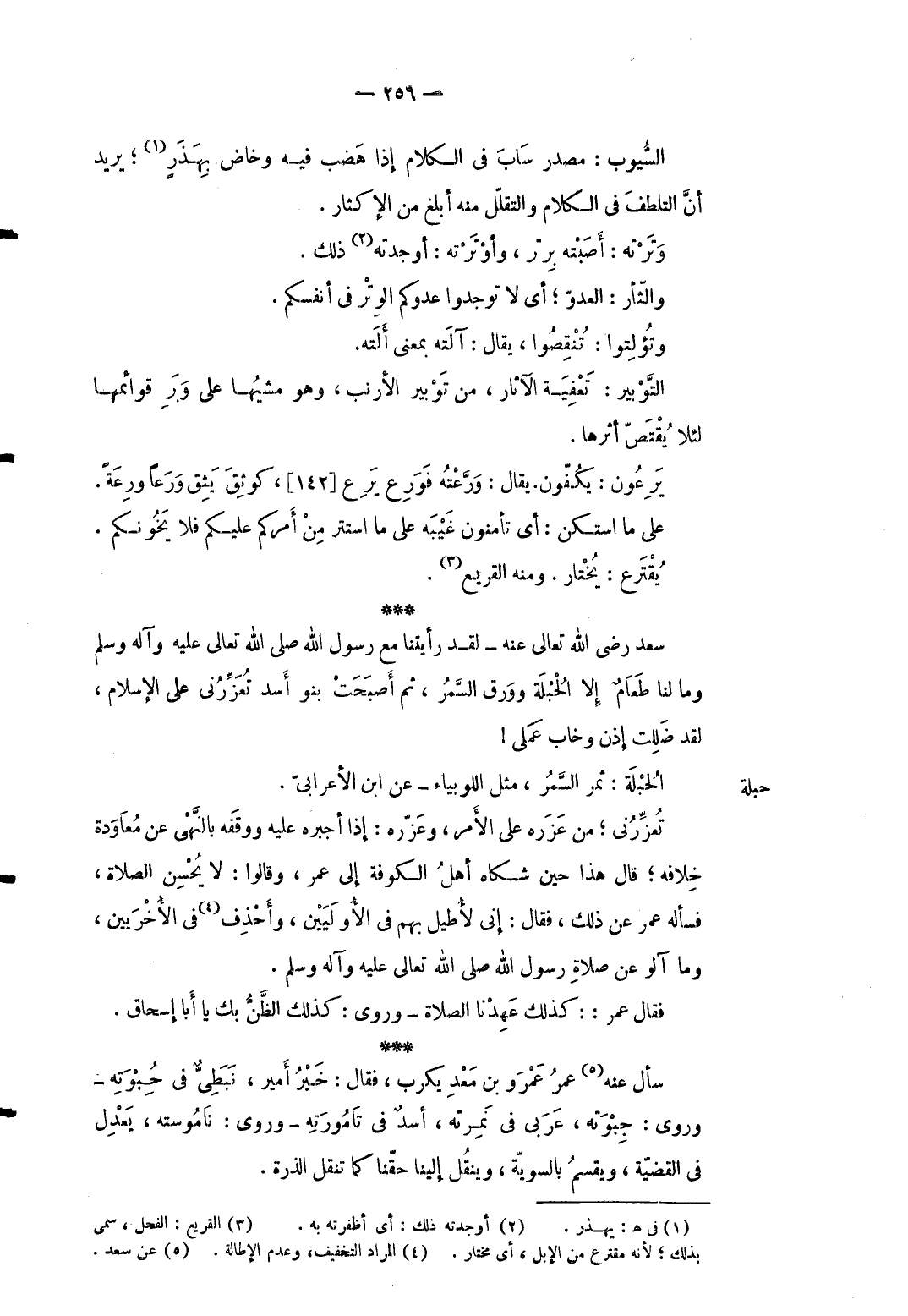 اليسوب: مصدر سَاب فِي الْكَلَام إِذا هضب فِيهِ وخاض بهذرٍ يُرِيد أَن التلطف فِي الْكَلَام والتقلل مِنْهُ أبلغ من الْإِكْثَار. وترته: أصبته برتر وأوترته: أوجدته ذَلِك. والثأر: الْعَدو أَي لَا توجدوا عَدوكُمْ الْوتر فِي أَنفسكُم. وتؤلتوا: تنقصوا يُقَال: آلَته بِمَعْنى ألته. التوبير: تعفية الْآثَار من توبير الأرنب وَهُوَ مشيها على وبر قَوَائِمهَا لِئَلَّا يقْتَصّ أَثَرهَا. يرعون: يكفون. يُقَال: ورَّعته فورع يرع [142] كوثق يَثِق ورعا ورعة. على مَا استكن: أَي تأمنون غيبه على مَا استتر من أَمركُم عَلَيْكُم فَلَا يخونكم. يقترع: يُختار. وَمِنْه القريع. سعد رَضِي الله تَعَالَى عَنهُ: لقد رَأَيْتنَا مَعَ رَسُول الله صلى الله تَعَالَى عَلَيْهِ وَآله وَسلم وَمَا لنا طعامٌ إِلَّا الحبلة وورق السمر ثمَّ أَصبَحت بَنو أَسد تعزرني على الْإِسْلَام لقد ضللت إِذن وخاب عَمَلي