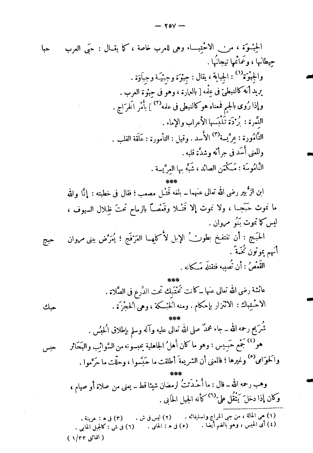 حبج الحبج: أَن تنتفخ بطُون الْإِبِل لأكلها العرفج يعرض ببني مَرْوَان أَنهم يموتون تخمة. القعص: أَن تصيبه فتقتله مَكَانَهُ. عَائِشَة رَضِي الله تَعَالَى عَنْهَا كَانَت تحتبك تَحت الدرْع فِي الصَّلَاة.