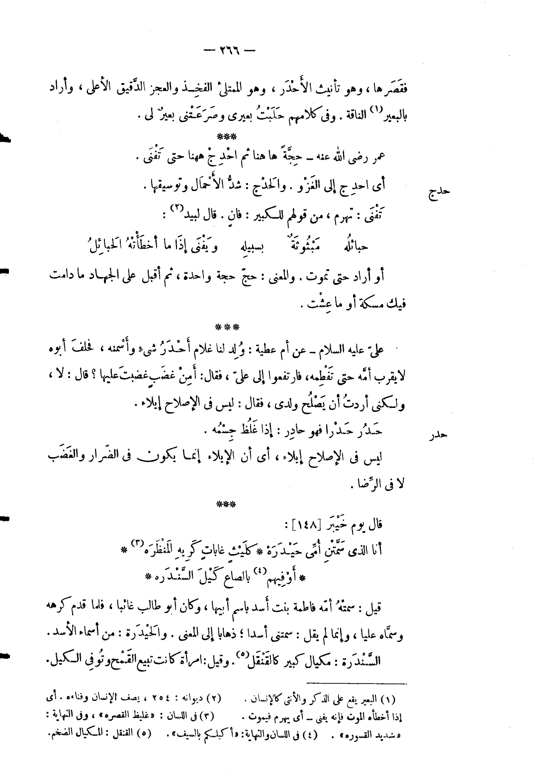 حدج أَي احدج إِلَى الْغَزْو. والحدج: شدُّ الْأَحْمَال وتوسيقها. تفنى: تهرم من قَوْلهم للكبير: فانٍ. قَالَ لبيد: ... حبائُله مَبْثُوثَةٌ بسبيلهِ ... ويَفْنَى إذَا مَا أخطَأْتْهُ الحَبائِلُ ... أَو أَرَادَ حَتَّى تَمُوت. وَالْمعْنَى: حج حجَّة وَاحِدَة ثمَّ أقبل على الْجِهَاد مَا دَامَت فِيك مسكة أَو مَا عِشْت. عَليّ عَلَيْهِ السَّلَام عَن أم عَطِيَّة: وُلد لنا غُلَام أحدر شَيْء وأسمنه فَحلف أَبوهُ لَا يقرب أمه حَتَّى تفطمه فَارْتَفعُوا إِلَى عَليّ فَقَالَ: أَمن غضب غضِبت عَلَيْهَا قَالَ: لَا وَلَكِنِّي أردْت أَن يصلح وَلَدي فَقَالَ: لَيْسَ فِي الْإِصْلَاح إِيلَاء.