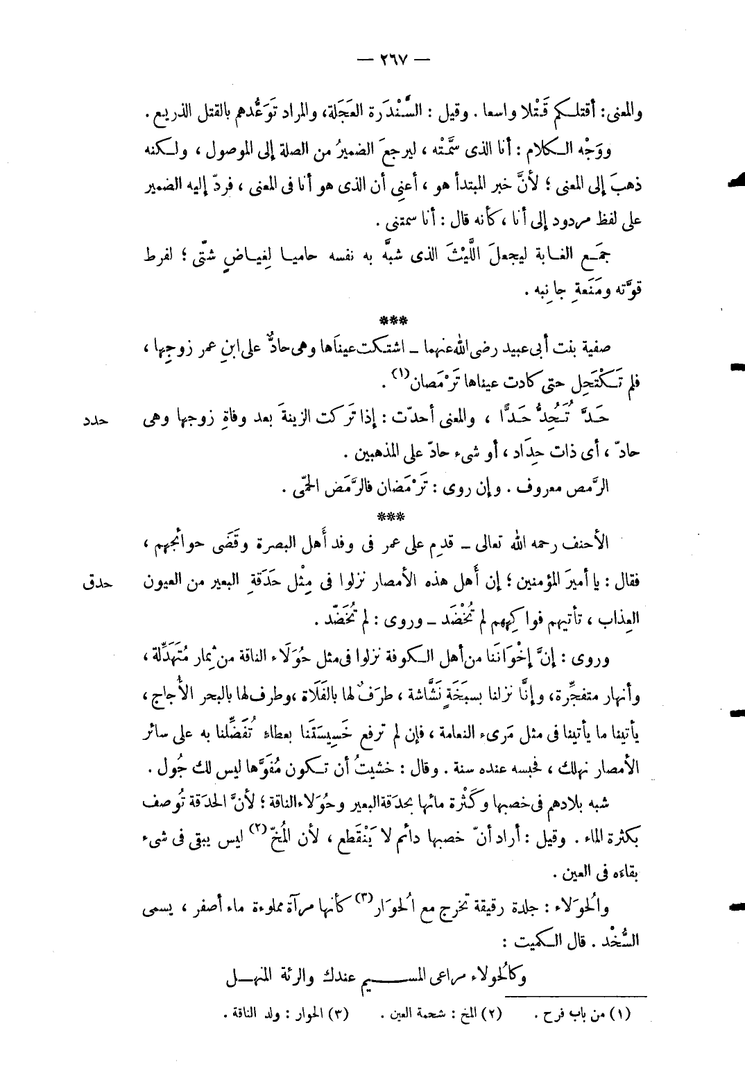 وَالْمعْنَى أقتلكم قتلا وَاسِعًا. وَقيل: السندرة العجلة وَالْمرَاد توعدهم بِالْقَتْلِ الذريع. وَوجه الْكَلَام: أَنا الَّذِي سمَّته ليرْجع الضَّمِير من الصِّلَة إِلَى الْمَوْصُول وَلكنه ذهب إِلَى الْمَعْنى لِأَن خبر الْمُبْتَدَأ هُوَ أَعنِي أَن الَّذِي هُوَ أَنا فِي الْمَعْنى فَرد إِلَيْهِ الضَّمِير على لفظ مَرْدُود إِلَى أَنا كَأَنَّهُ قَالَ: أَنا سمتني. جمع الغابة ليجعل اللَّيْث الَّذِي شبه بِهِ نَفسه حاميا لغياض شَتَّى لفرط قوته وَمنعه جَانِبه. صَفِيَّة بنت أبي عبيد رَضِي الله عَنْهُمَا: اشتكت عَيناهَا وَهِي حادٌّ على ابْن عمر زَوجهَا فَلم تكتحل حَتَّى كَادَت عَيناهَا ترمصان.