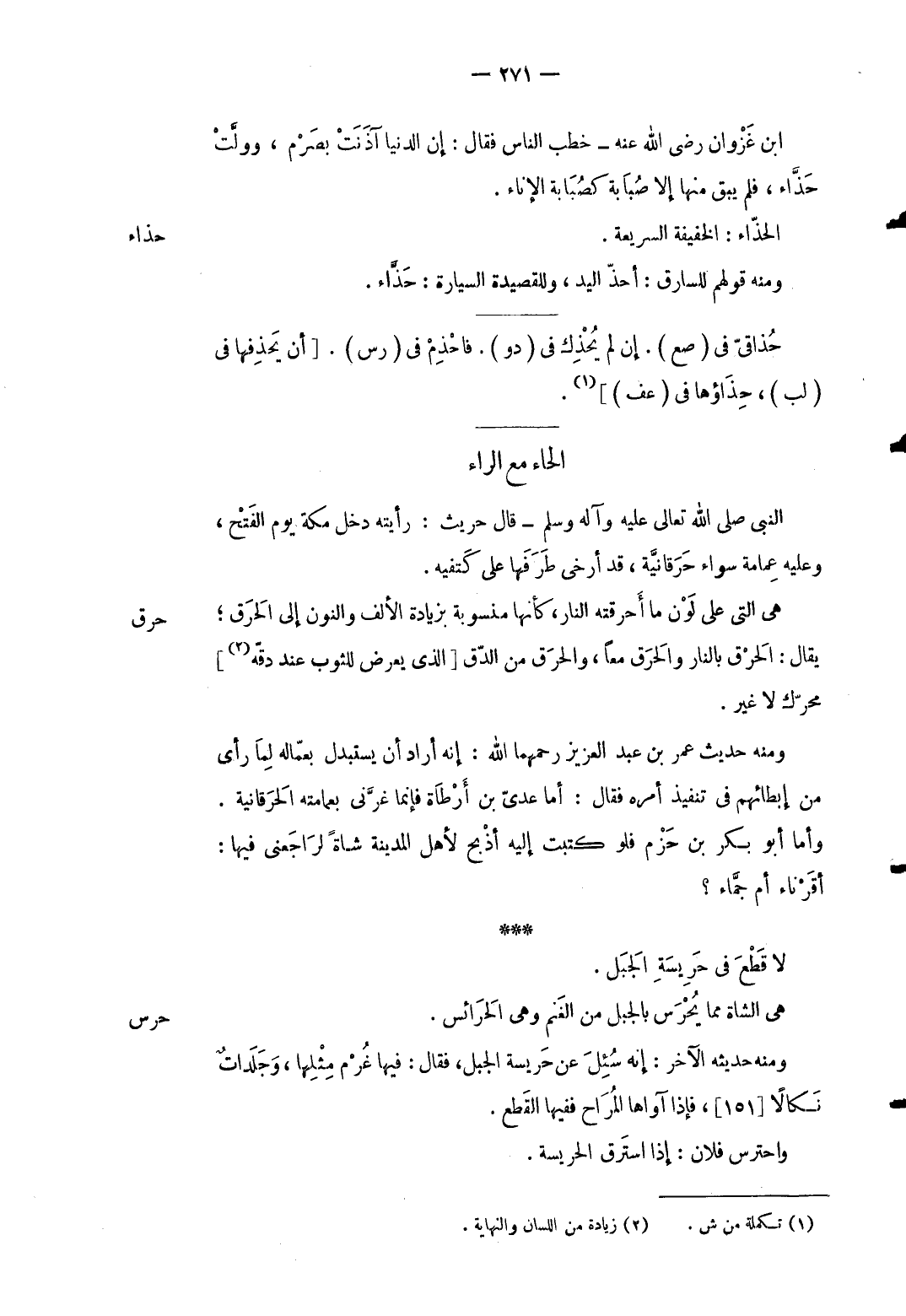 حرس هِيَ الشَّاة مِمَّا يحرس بِالْجَبَلِ من الْغنم وَهِي الحرائس. وَمِنْه حَدِيثه الآخر: إِنَّه سُئل عَن حريسة الْجَبَل فَقَالَ: فِيهَا غرم مثلهَا وجلدات نكالاً [151] فَإِذا آواها المراح فَفِيهَا الْقطع. واحترس فلَان: إِذا اسْترق الحريسة.