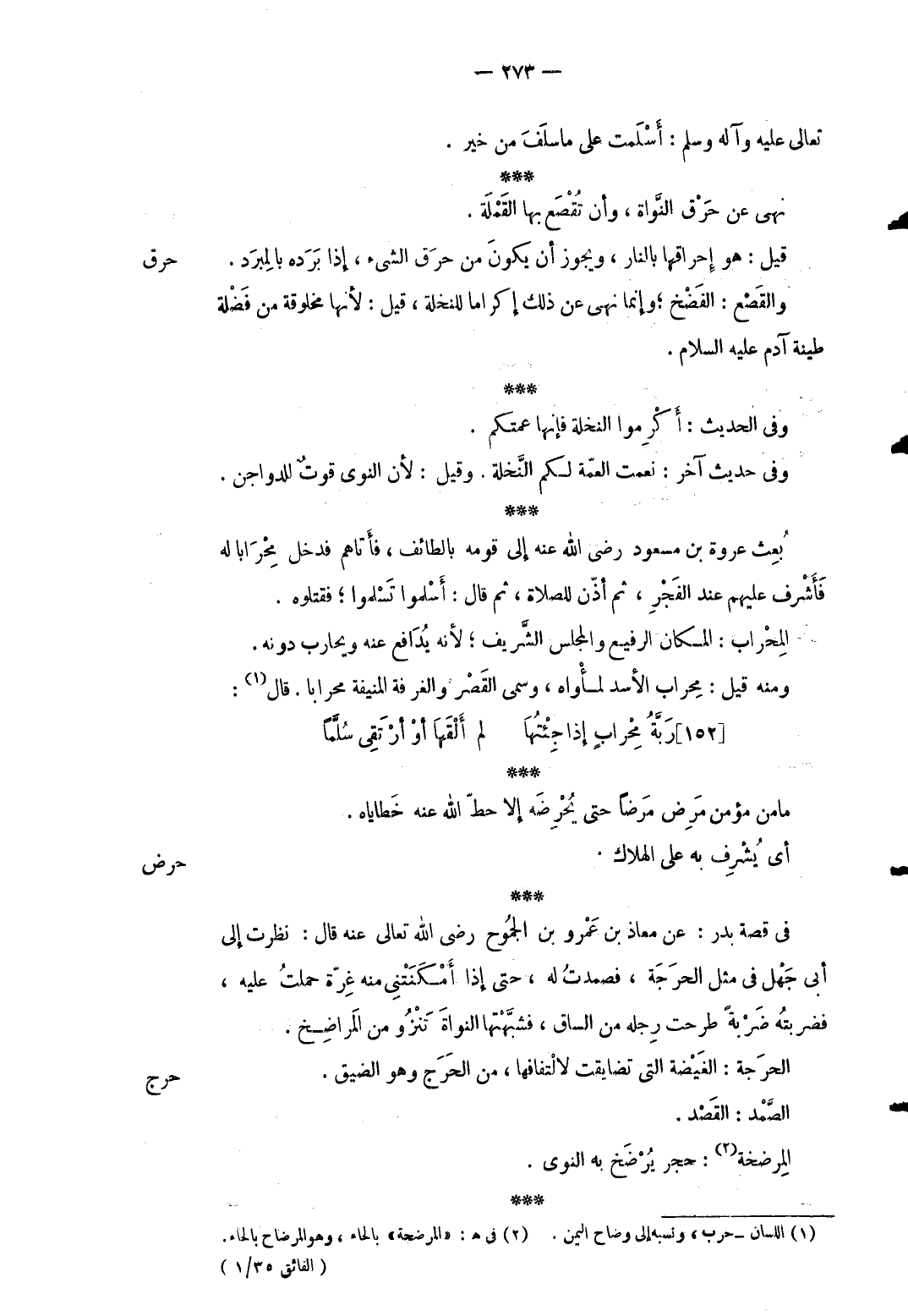 حرج الحرجة: الغيضة الَّتِى تضايقت لالتفافها من الْحَرج وَهُوَ الضّيق. الصَّمد: الْقَصْد. المرضخة: حجر يرْضخ بِهِ النَّوَى.