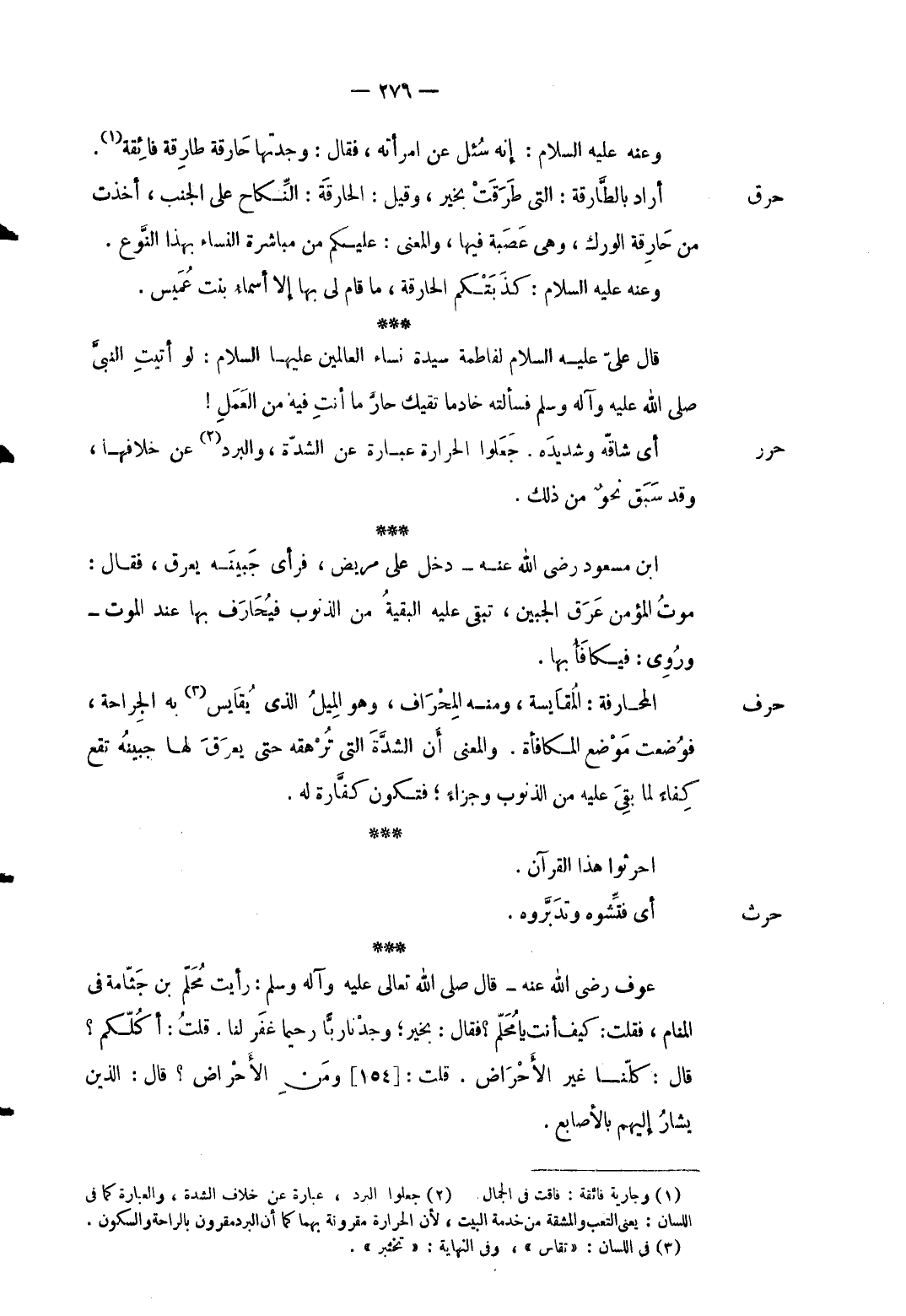طرق أَرَادَ بالطارقة: الَّتِي طرقت بِخَير وَقيل: الحارقة: النِّكاح على الْجنب أخذت من حارقة الورك وَهِي عصبَة فِيهَا وَالْمعْنَى: عَلَيْكُم من مُبَاشرَة النِّسَاء بِهَذَا النَّوْع. وَعنهُ عَلَيْهِ السَّلَام: كذبتكم الحارقة مَا قَامَ لي بهَا إِلَّا أَسمَاء بنت عُمَيْس. قَالَ عَليّ عَلَيْهِ السَّلَام لفاطمة سيدة نسَاء الْعَالمين عَلَيْهَا السَّلَام: لَو أتيت النَّبِي صلى الله تَعَالَى عَلَيْهِ وَآله وَسلم فَسَأَلته خَادِمًا تقيك حارَّ مَا أَنْت فِيهِ من الْعَمَل
