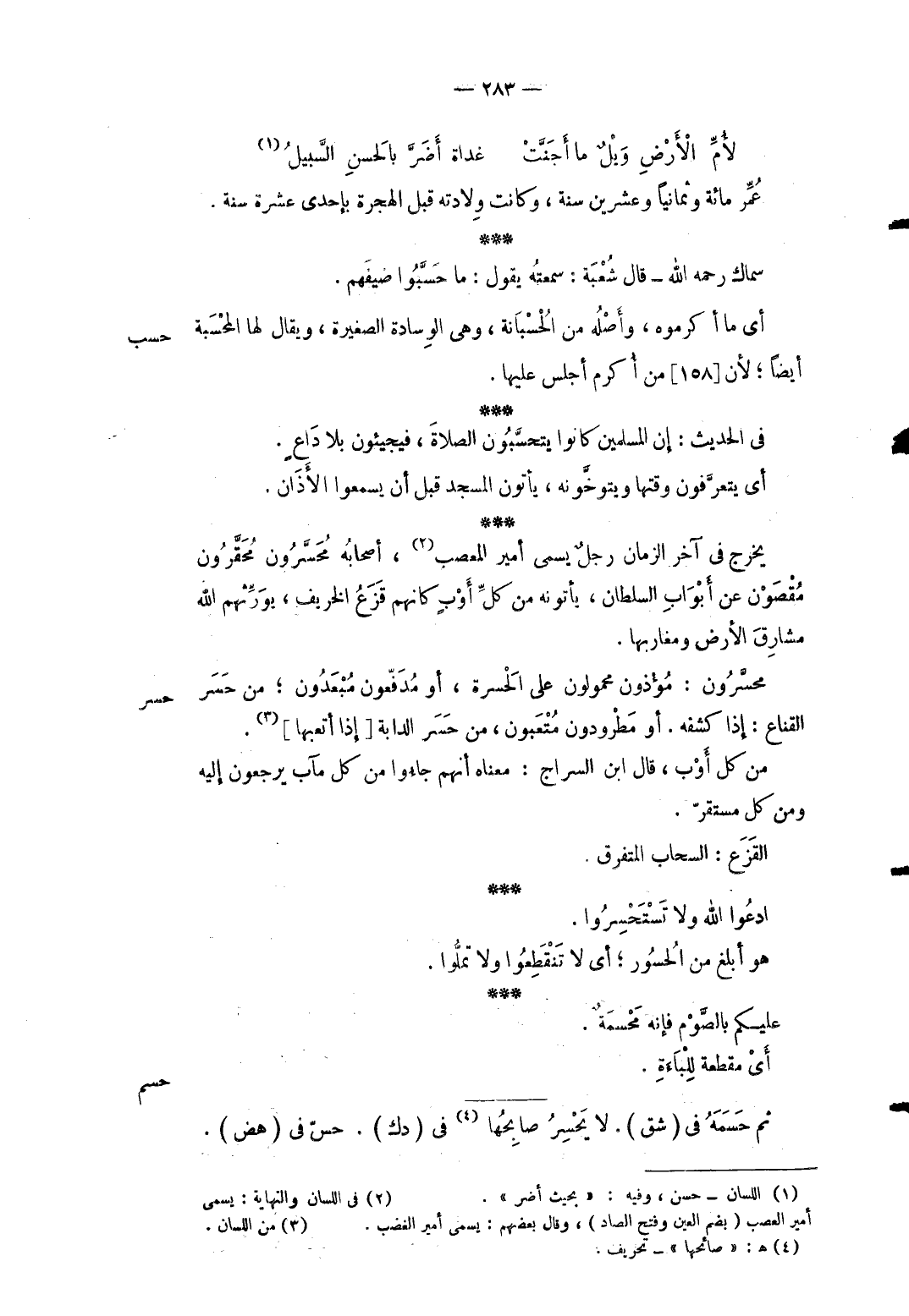 حسر محسَّرون: مؤذون محمولون على الْحَسْرَة أَو مدفَّعون مبعدون من حسر القناع: إِذا كشفه. أَو مطرودون متعبون من حسر الدَّابَّة إِذا أتعبها. من كل أَوب قَالَ ابْن السراج: مَعْنَاهُ أَنهم جَاءُوا من كل مآب يرجعُونَ إِلَيْهِ وَمن كل مُسْتَقر. القزع: السَّحَاب المتفرق. ادعوا الله وَلَا تستحسروا. هُوَ أبلغ من الحسور أَي لَا تنقطعوا وَلَا تملوا. عَلَيْكُم بِالصَّوْمِ فَإِنَّهُ محسمة.