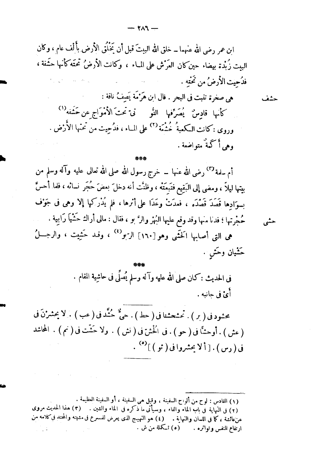 حشى وَهِي الَّتِي أَصَابَهَا الحشى وَهُوَ الربو [16] وَقد حشيت وَالرجل حشيان وحشٍ. فِي الحَدِيث: كَانَ صلى الله عَلَيْهِ وَسلم يُصَلِّي فِي حَاشِيَة الْمقَام. أَي فِي جَانِبه. محشود فِي بر. تحشحشنا فِي حط. حيٌّ حشَّد فِي عب. لَا يحشرن فِي عش. أوحشا فِي حو. فِي الحش فِي نش. وَلَا حشت فِي نم. المحاشد فِي رس. أَلا يحْشرُوا فِي ثو.