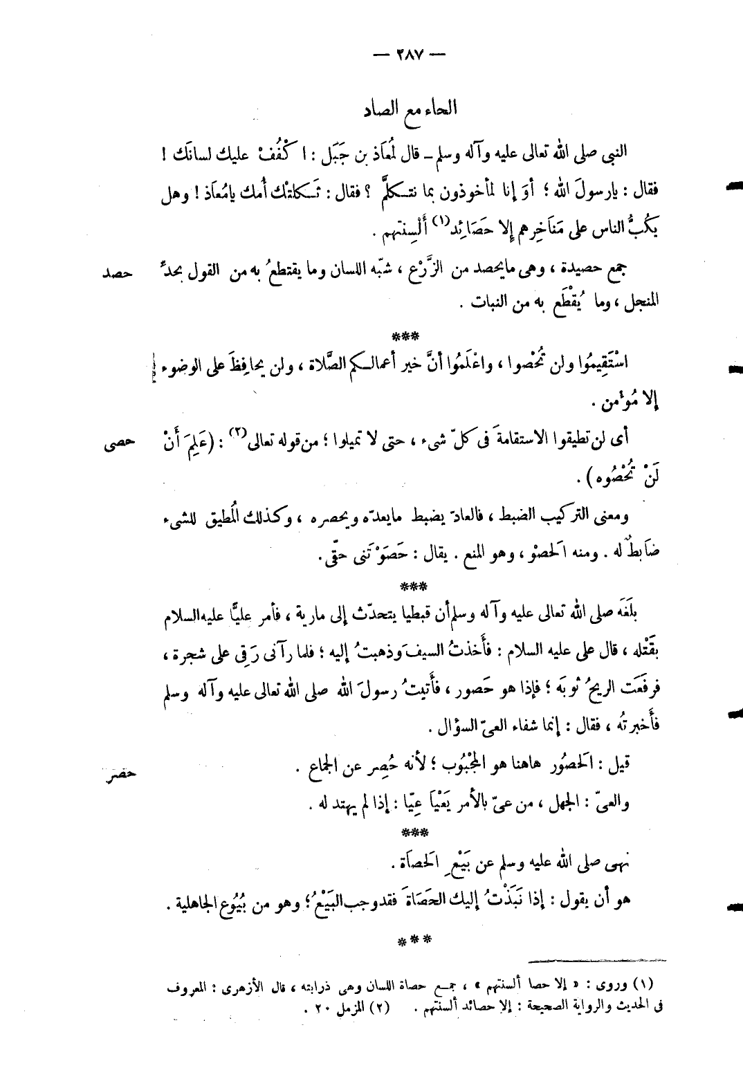 حصد جمع حصيدة وَهِي مَا يحصد من الزَّرْع شبه اللِّسَان وَمَا يقتطع بِهِ من القَوْل بحدِّ المنجل وَمَا يُقطع بِهِ من النَّبَات. اسْتَقِيمُوا وَلنْ تُحْصُوا وَاعْلَمُوا أَن خير أَعمالكُم الصَّلَاة وَلنْ يحافظ على الْوضُوء إِلَّا مُؤمن.