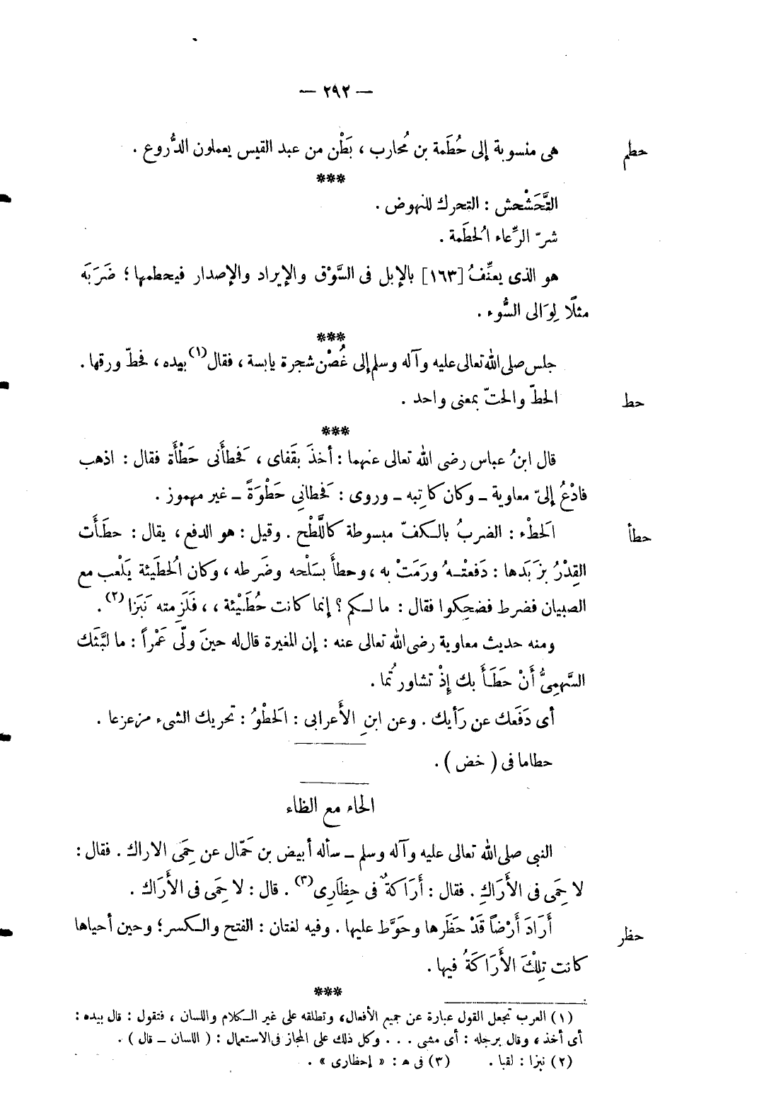 حطم هِيَ منسوبة إِلَى حطمة بن محَارب بطن من عبد الْقَيْس يعْملُونَ الدروع. التحشحش: التحرك للنهوض. شَرّ الرعاء الحُطمة. هُوَ الَّذِي يعنف [163] بِالْإِبِلِ فِي السُّوق والإيراد والإصدار فيحطهما ضربه مثلا لوالي السوء. جلس صلى الله تَعَالَى عَلَيْهِ وَآله وَسلم إِلَى غُصْن شَجَرَة يابسة فَقَالَ بِيَدِهِ فحط وَرقهَا.