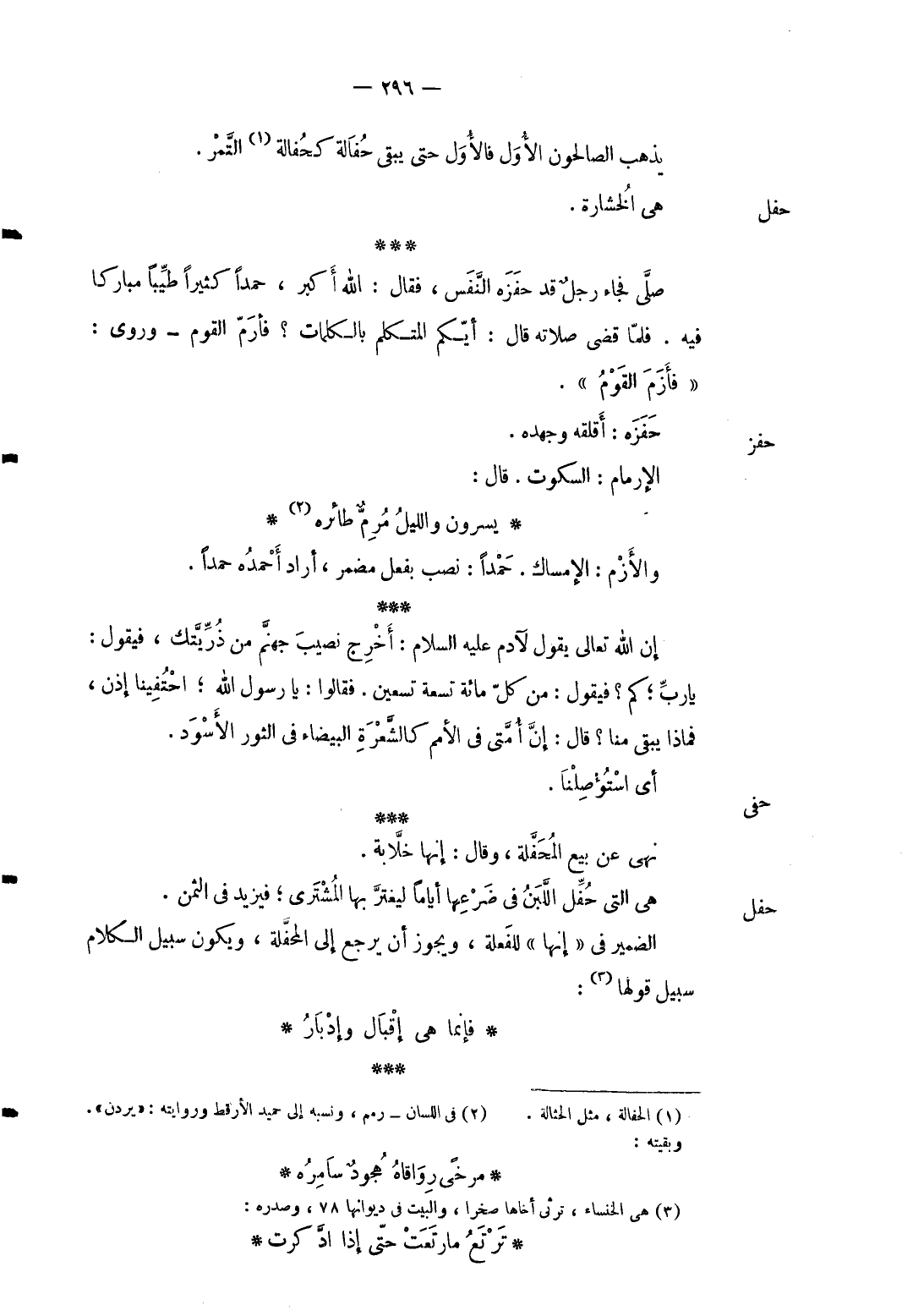 حفز حفزة: أقلقه وَجهد هـ. الإرمام: السُّكُوت. قَالَ: ... يسرون والليلُ مُرِمٌّ طَائِره ... والأزم: الْإِمْسَاك. حمداً. نصب بِفعل مُضْمر أَرَادَ أَحْمَده حمداً. إِن الله تَعَالَى يَقُول لآدَم عَلَيْهِ السَّلَام: أخرج نصيب جَهَنَّم من ذريتك فَيَقُول: يَا ربِّ كم فَيَقُول: من كل مائَة تِسْعَة تسعين. فَقَالُوا: يَا رَسُول الله احتفينا إِذن فَمَاذَا يبْقى منا قَالَ: إِن أمتِي فِي الْأُمَم كالشعرة الْبَيْضَاء فِي الثور الْأسود.
