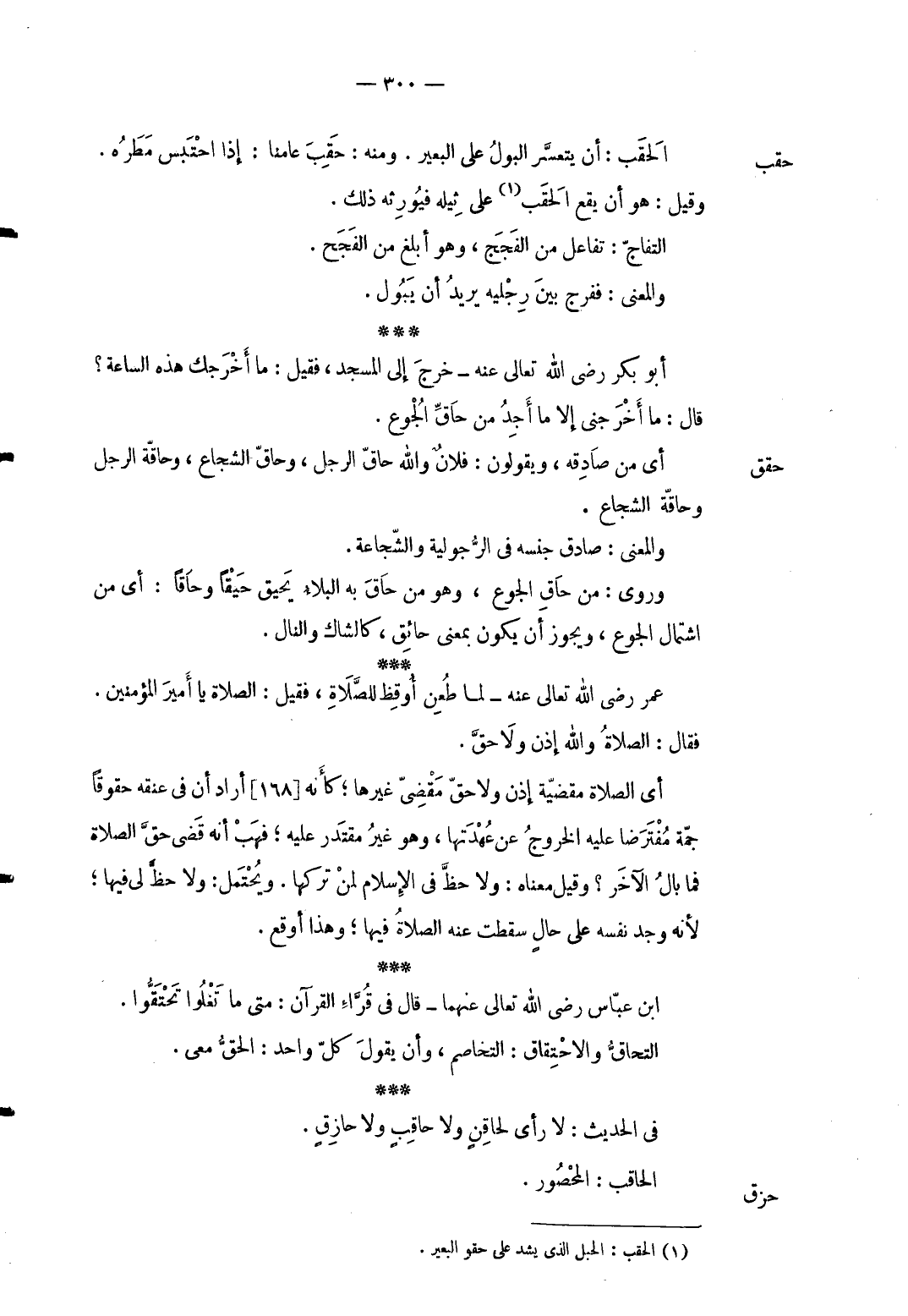 حقب الحقب: أَن يتعسر الْبَوْل على الْبَعِير. وَمِنْه: حقب عامنا: إِذا احْتبسَ مطره وَقيل: هُوَ أَن يَقع الحقب على ثيله فيورثه ذَلِك. التفاج: تفَاعل من الفجج وَهُوَ أبلغ من الفجح. وَالْمعْنَى: فَفرج بَين رجلَيْهِ يُرِيد أَن يَبُول. أَبُو بكر رَضِي الله تَعَالَى عَنهُ خرج إِلَى الْمَسْجِد فَقيل: مِمَّا أخرجك هَذِه السَّاعَة قَالَ: مَا أخرجني إِلَّا مَا أجد من حاق الْجُوع.