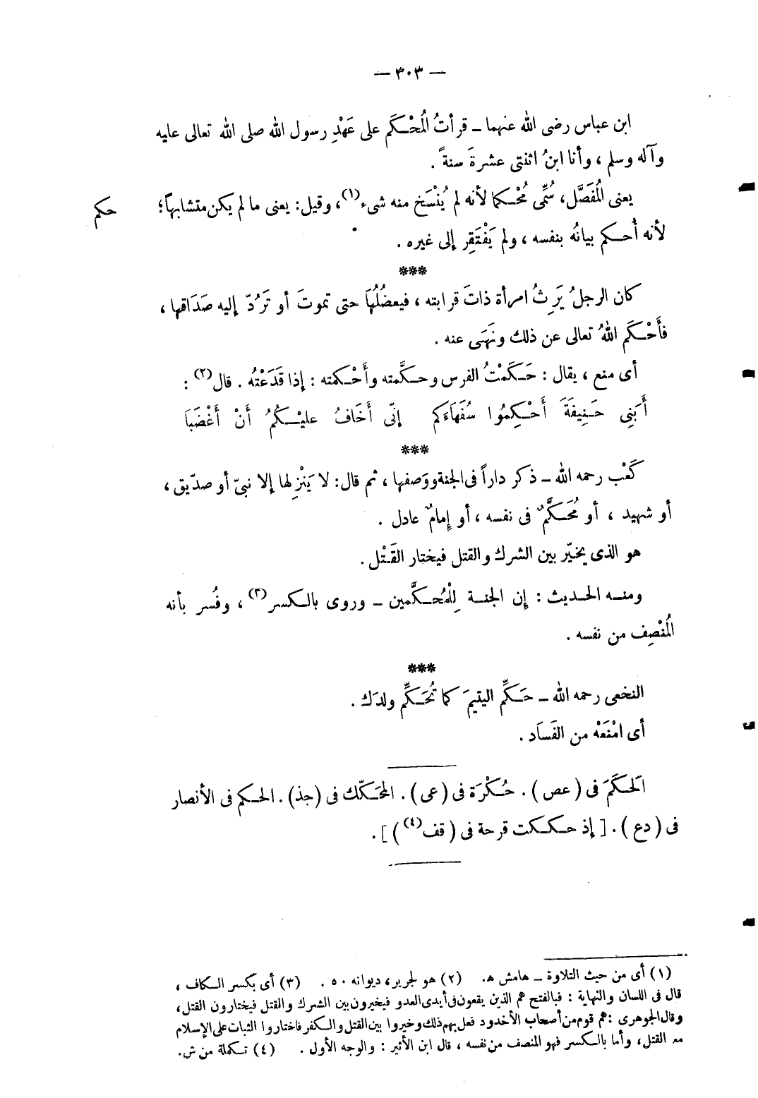 حكم يَعْنِي الْمفصل سمي محكما لِأَنَّهُ لم ينْسَخ مِنْهُ شَيْء وَقيل: يَعْنِي مَا لم يكن متشابهاً لِأَنَّهُ أُحكم بَيَانه بِنَفسِهِ وَلم يفْتَقر إِلَى غَيره. كَانَ الرجل يَرث امْرَأَة ذَات قرَابَته فيعضلها حَتَّى تَمُوت أَو ترد إِلَيْهِ صَدَاقهَا فأحكم الله تَعَالَى عَن ذَلِك وَنهى عَنهُ. أَي منع يُقَال: حكمت الْفرس وحكَّمته وأحكمته: إِذا قدعته. قَالَ: ... أَبنِي حَنِيَفَةَ أَحْكِمُوا سُفَهَاءَكم ... إنّي أَخَافُ عليْكُمُ أَنْ أَغْضَبَا ... كَعْب رَحمَه الله ذكر دَارا فِي الْجنَّة ووصفها ثمَّ قَالَ: لَا ينزلها إِلَّا نَبِي أَو صدّيق أَو شَهِيد أَو مُحكَّم فِي نَفسه أَو إِمَام عَادل. هُوَ الَّذِي يُخَيّر بَين الشّرك وَالْقَتْل فيختار الْقَتْل. وَمِنْه الحَدِيث: إِن الْجنَّة للمحكمين. وروى بِالْكَسْرِ وفُسر بِأَنَّهُ الْمنصف من نَفسه. النَّخعِيّ رَحمَه الله: حكم الْيَتِيم كَمَا تحكم ولدك. أَي امنعه من الْفساد. الحكم فِي عص. حكرة فِي عى. المحكك فِي حذ. الحكم فِي الْأَنْصَار فِي دع. إِذا حككت قرحَة فِي قف.