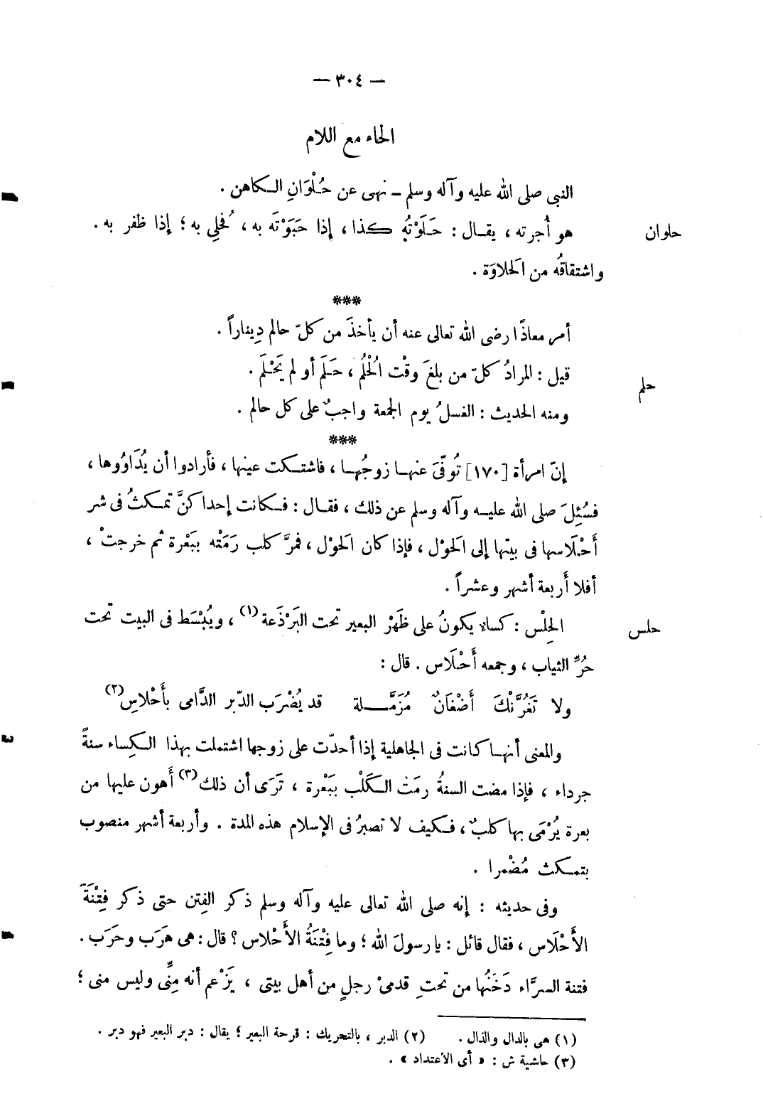 حلم قيل: المُرَاد كل من بلغ وَقت الْحلم حلم أَو لم يحلم. وَمِنْه الحَدِيث: الْغسْل يَوْم الْجُمُعَة وَاجِب على كل حالم. إِن امْرَأَة توفّي عَنْهَا زَوجهَا فاشتكت عينهَا فأرادوا أَن يداووها فَسئلَ صلى الله عَلَيْهِ وَسلم عَن ذَلِك فَقَالَ: فَكَانَت إحداكن تمكث فِي شَرّ أحلاسها فِي بَيتهَا إِلَى الْحول فَإِذا كَانَ الْحول فَمر كلب رمته ببعرة ثمَّ خرجت أَفلا أَرْبَعَة أشهر وَعشر ا.