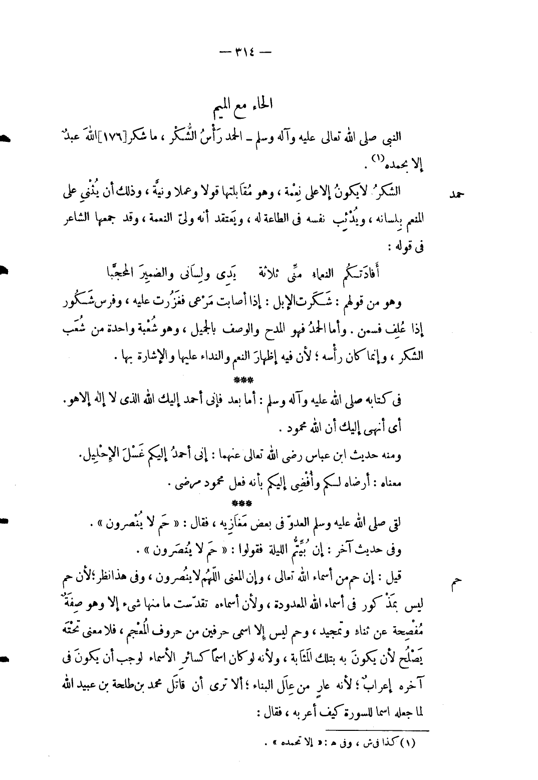 حمد الشُّكْر لَا يكون إِلَّا على نعْمَة وَهُوَ مقابلتها قولا وَعَملا وَنِيَّة وَذَلِكَ أَن يثني على الْمُنعم بِلِسَانِهِ ويدئب نَفسه فِي الطَّاعَة لَهُ ويعتقد أَنه ولي النِّعْمَة وَقد جمعهَا الشَّاعِر فِي قَوْله: ... أَفادَتكُم النعماءُ منِّي ثَلَاثَة ... يَدِي ولِسَاني والضمِيرَ المحجَّبا ... وَهُوَ من قَوْلهم: شكرت الْإِبِل: إِذا أَصَابَت مرعى فغزرت عَلَيْهِ وَفرس شكور إِذا عُلف فسمن. وَأما الْحَمد فَهُوَ الْمَدْح وَالْوَصْف بالجميل وَهُوَ شُعْبَة وَاحِدَة من شعب الشُّكْر وَإِنَّمَا كَانَ رَأسه لِأَن فِيهِ إِظْهَار النعم والنداء عَلَيْهَا وَالْإِشَارَة بهَا. فِي كِتَابه صلى الله عَلَيْهِ وَسلم: أما بعد فَإِنِّي أَحْمد إِلَيْك الله الَّذِي لَا إِلَه إِلَّا هُوَ. أَي أنهى إِلَيْك أَن الله مَحْمُود. وَمِنْه حَدِيث ابْن عَبَّاس رَضِي الله عَنْهُمَا: إنى أَحْمد إِلَيْكُم غسل الإحليل. وَمَعْنَاهُ: أرضاه لكم وأُفضي إِلَيْكُم بِأَنَّهُ فعل مَحْمُود مرضِي. لَقِي صلى الله عَلَيْهِ وَسلم الْعَدو فِي بعض مغازيه فَقَالَ حم لَا يُنصرون. وَفِي حَدِيث آخر: إِن بيتم اللَّيْلَة فَقولُوا حم لَا ينْصرُونَ.