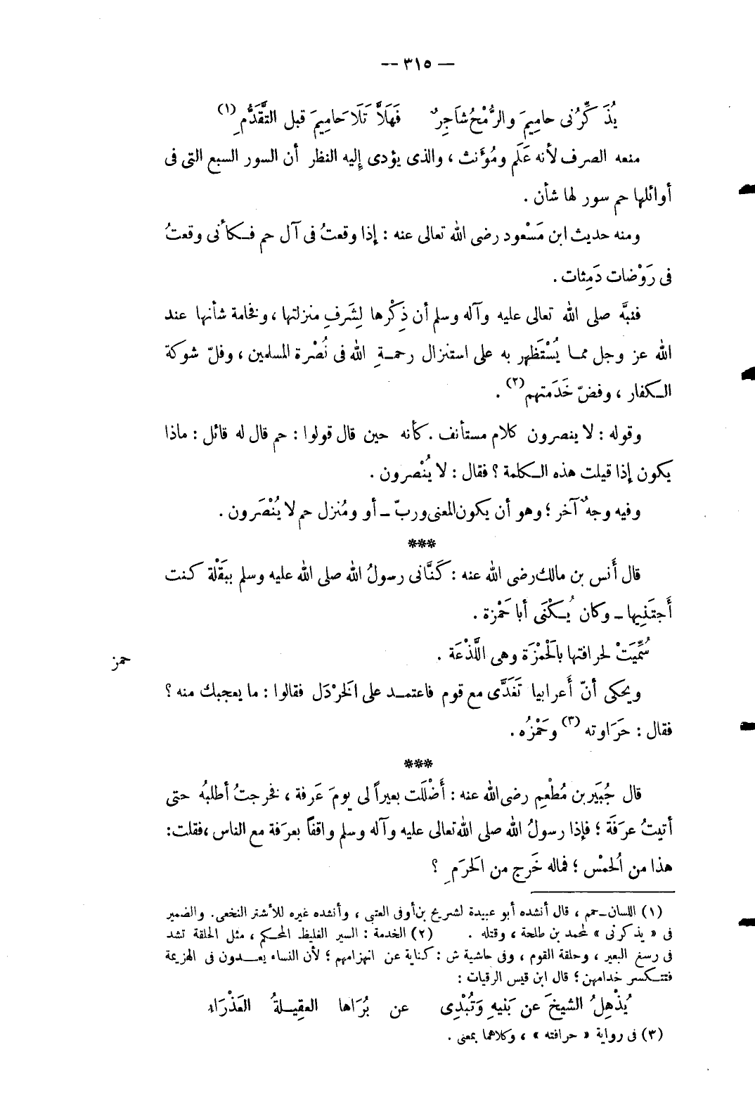 .. يُذَكِّرُني حامِيمَ والرُّمْحُ شَاجِرٌ ... فَهَلاَّ تَلاَ حامِيمَ قبل التَّقَدُّم ... مَنعه الصّرْف لِأَنَّهُ علم ومؤنث وَالَّذِي يُؤَدِّي إِلَيْهِ النّظر أَن السُّور السَّبع الَّتِي فِي أوائلها حم سور لَهَا شَأْن. وَمِنْه حَدِيث ابْن مَسْعُود رَضِي الله تَعَالَى عَنهُ: إِذا وَقعت فِي آل حم فَكَأَنِّي وَقعت فِي روضات دمثات. فنبه صلى الله تَعَالَى عَلَيْهِ وَآله وَسلم أَن ذكرهَا لشرف منزلتها وفخامة شَأْنهَا عِنْد الله عز وَجل مِمَّا يستظهر بِهِ على استنزال رَحْمَة الله فِي نصْرَة الْمُسلمين وفل شَوْكَة الْكفَّار وفص خدمتهم. وَقَوله: لَا ينْصرُونَ كَلَام مُسْتَأْنف. كَأَنَّهُ حِين قَالَ قَالُوا: حم قَالَ لَهُ قَائِل: مَاذَا يكون إِذا قيلت هَذِه الْكَلِمَة فَقَالَ: لَا ينْصرُونَ. وَفِيه وَجه آخر وَهُوَ أَن يكون الْمَعْنى وربّ. أَو منزل حم لَا ينْصرُونَ. قَالَ أنس بن مَالك رَضِي الله عَنهُ: كنَّاني رَسُول الله صلى الله عَلَيْهِ وَسلم ببقلة كنت أجتنيها وَكَانَ يكنى أَبَا حَمْزَة.
