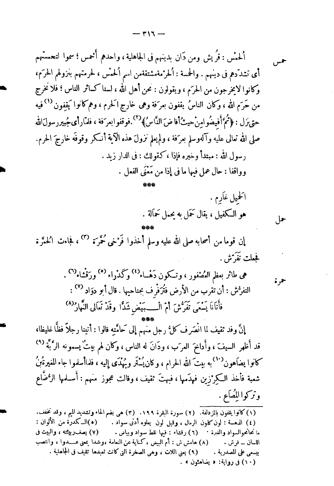 حمس الحمس: قُرَيْش وَمن دَان بدينهم فِي الْجَاهِلِيَّة واحدهم أحمس سموا لتحمسهم أَي تشددهم فِي دينهم. والحمسة: الْحُرْمَة مُشْتَقَّة من اسْم الحم س لحرمتهم بنزولهم الْحرم وَكَانُوا لَا يخرجُون من الْحرم وَيَقُولُونَ: نَحن أهل الله لسنا كَسَائِر النَّاس فَلَا نخرج من حرم الله وَكَانَ النَّاس يقفون بِعَرَفَة وَهِي خَارج الْحرم وهم كَانُوا يقفون فِيهِ حَتَّى نزل: {ثُمَّ أََِفيضُوا مِنْ حيثُ أفاضَ النَّاسُ} . فوقفوا بِعَرَفَة فَلَمَّا رأى جُبَير رَسُول الله صلى الله تَعَالَى عَلَيْهِ وَآله وَسلم بِعَرَفَة وَلم يعلم نزُول الْآيَة أنكر هَذِه وُقُوفه خَارج الْحرم. رَسُول الله: مُبْتَدأ وَخبر فَإِذا كَقَوْلِك: فِي الدَّار زيد. وواقفا: حَال عمل فِيهَا مَا فِي إِذا من معنى الْفِعْل. الْحميل غَارِم.