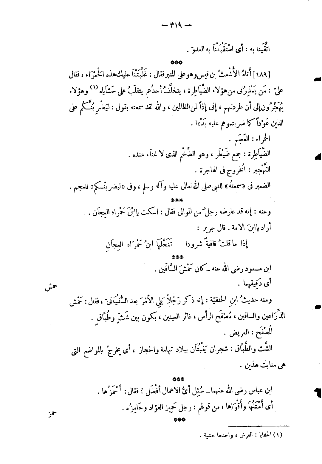 9 - اتَّقينا بِهِ: أَي استقبلنا بِهِ الْعَدو. [189] أَتَاهُ الْأَشْعَث بن قيس وَهُوَ على الْمِنْبَر فَقَالَ: غلَّبتنا عَلَيْك هَذِه الْحَمْرَاء فَقَالَ عَليّ: من يعذرني من هَؤُلَاءِ الضياطرة يتَخَلَّف أحدهم يتقلب على حشاياه وَهَؤُلَاء يهجرون إِلَى أَن طردتهم إِنِّي إِذا لمن الظَّالِمين وَالله لقد سمعته يَقُول: ليضربنكم على الدّين عوداً كَمَا ضربتموهم عَلَيْهِ بدءًا. الْحَمْرَاء: الْعَجم. الضياطرة: جمع ضيطر وَهُوَ الضخم الَّذِي لَا غناء عِنْده. التهجير: الْخُرُوج فِي الهاجرة. الضَّمِير فِي سمعته للنَّبِي صلى الله تَعَالَى عَلَيْهِ وَآله وَسلم وَفِي ليضربنكم للعجم. وَعنهُ: إِنَّه قد عَارضه رجل من الموَالِي فَقَالَ: اسْكُتْ يَا ابْن حَمْرَاء العجان. أَرَادَ يَا ابْن الْأمة. قَالَ جرير: ... إِذا مَا قلتُ قافيةً شرودا ... تَنَحَّلَهَا ابنُ حَمْرَاءِ العِجَانِ ... ابْن مَسْعُود رَضِي الله عَنهُ كَانَ حمش السَّاقَيْن.