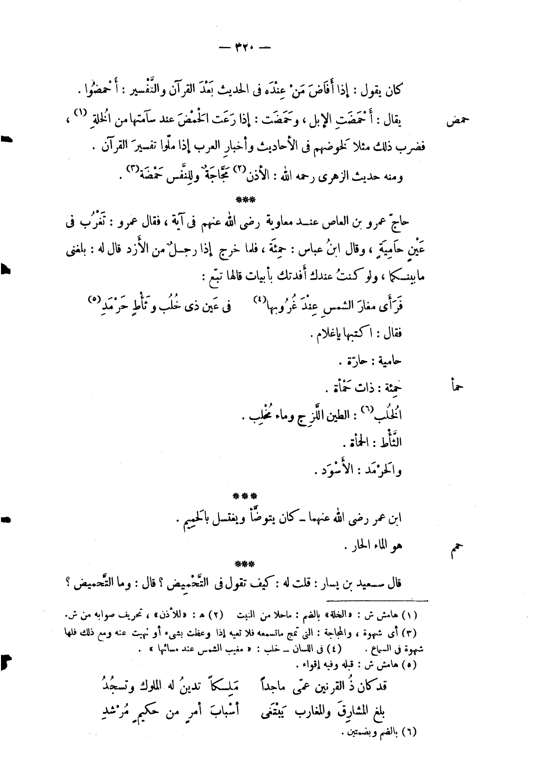 حمض يُقَال: أحمضت الْإِبِل وحمضت: إِذا رعت الحمض عِنْد سآمتها من الْخلَّة فَضرب ذَلِك مثلا لخوضهم فِي الْأَحَادِيث وأخبار الْعَرَب إِذا ملوا تَفْسِير الْقُرْآن. وَمِنْه حَدِيث الزُّهْرِيّ رَحمَه الله: الْأذن مجاجة وللنفس حمضة. حاجّ عَمْرو بن الْعَاصِ عِنْد مُعَاوِيَة رَضِي الله عَنْهُم فِي آيَة فَقَالَ عَمْرو: تغرب فِي عين حامية وَقَالَ ابْن عَبَّاس: حمئة فَلَمَّا خرج إِذا رجل من الأزد قَالَ لَهُ: بَلغنِي مَا بَيْنكُمَا وَلَو كنت عنْدك أفدتك بِأَبْيَات قَالَهَا تبّع: ... فَرَأَى مغارَ الشمسِ عِنْدَ غُرُوبها ... فِي عين خُلُب وثَأْطٍ حَرْمَدِ ... فَقَالَ: اُكْتُبْهَا يَا غُلَام. حامية: حارة.