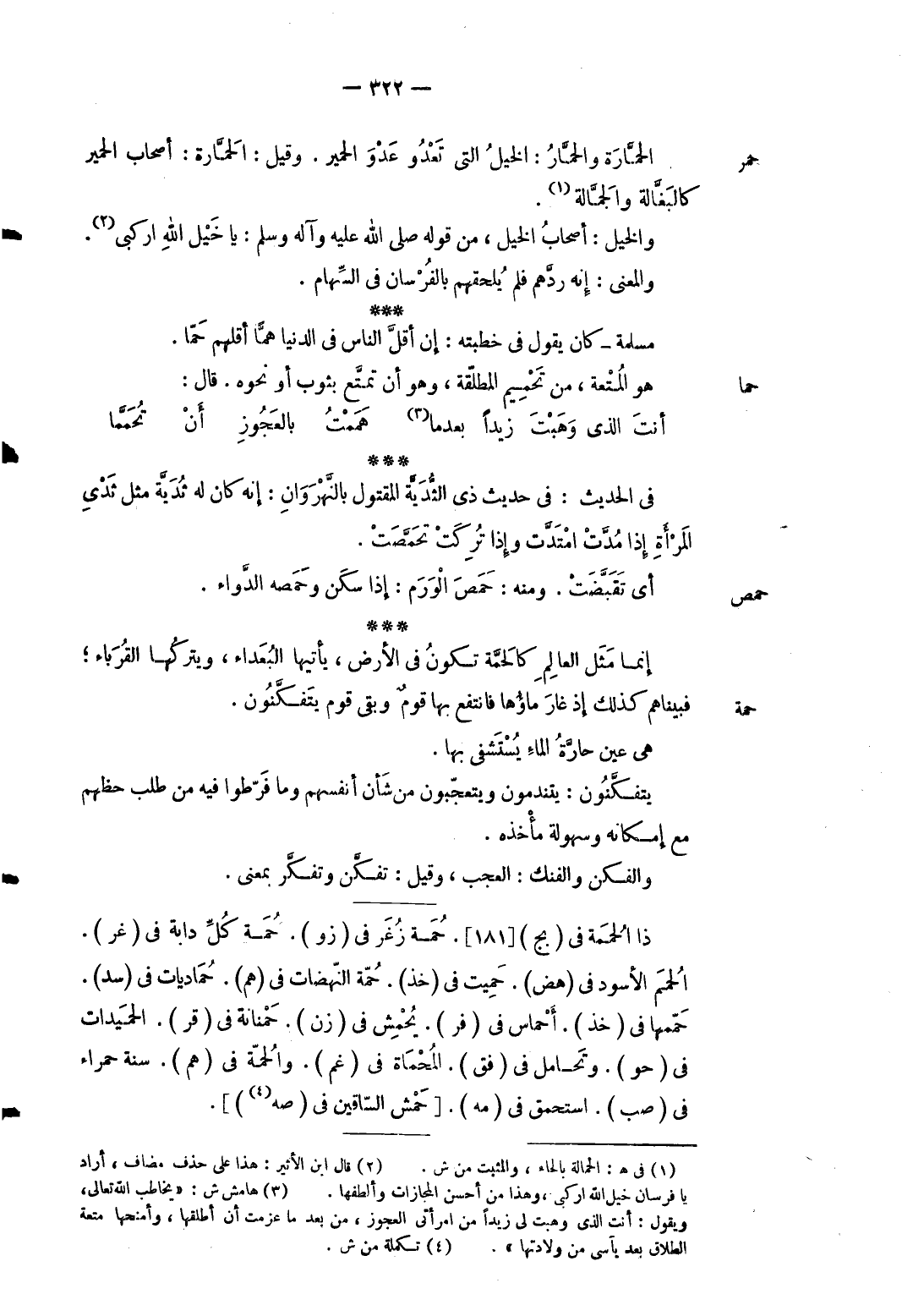 حمة فبيناهم كَذَلِك إِذْ أغار مَاؤُهَا فَانْتَفع بهَا قوم وَبَقِي قوم يتفكنون. هِيَ عين حارة المَاء يستشفي بهَا. يتفكنون: يتندمون ويتعجبون من شَأْن أنفسهم وَمَا فرطوا فِيهِ من طلب حظهم مَعَ إِمْكَانه وسهولة مأخذه. والفكن والفنك: الْعجب وَقيل: تفكَّن وتفكَّر بِمَعْنى. ذَا الحممة فِي بج. حمة زغر فِي زو. حمة كل دَابَّة فِي غر. الحمم الْأسود فِي هض. حميت فِي خُذ. حمة النهضات فِي هم. حماديات فِي سد. حممها فِي خُذ. أحماس فِي فر. يحمش فِي زن. حمنانة فِي قر. الحميدات فِي حو. وتحامل فِي فق. المحماة فِي غم. والحمة فِي هم. سنة حَمْرَاء فِي صب. استحمق فِي مَه. حمش السَّاقَيْن فِي صه.