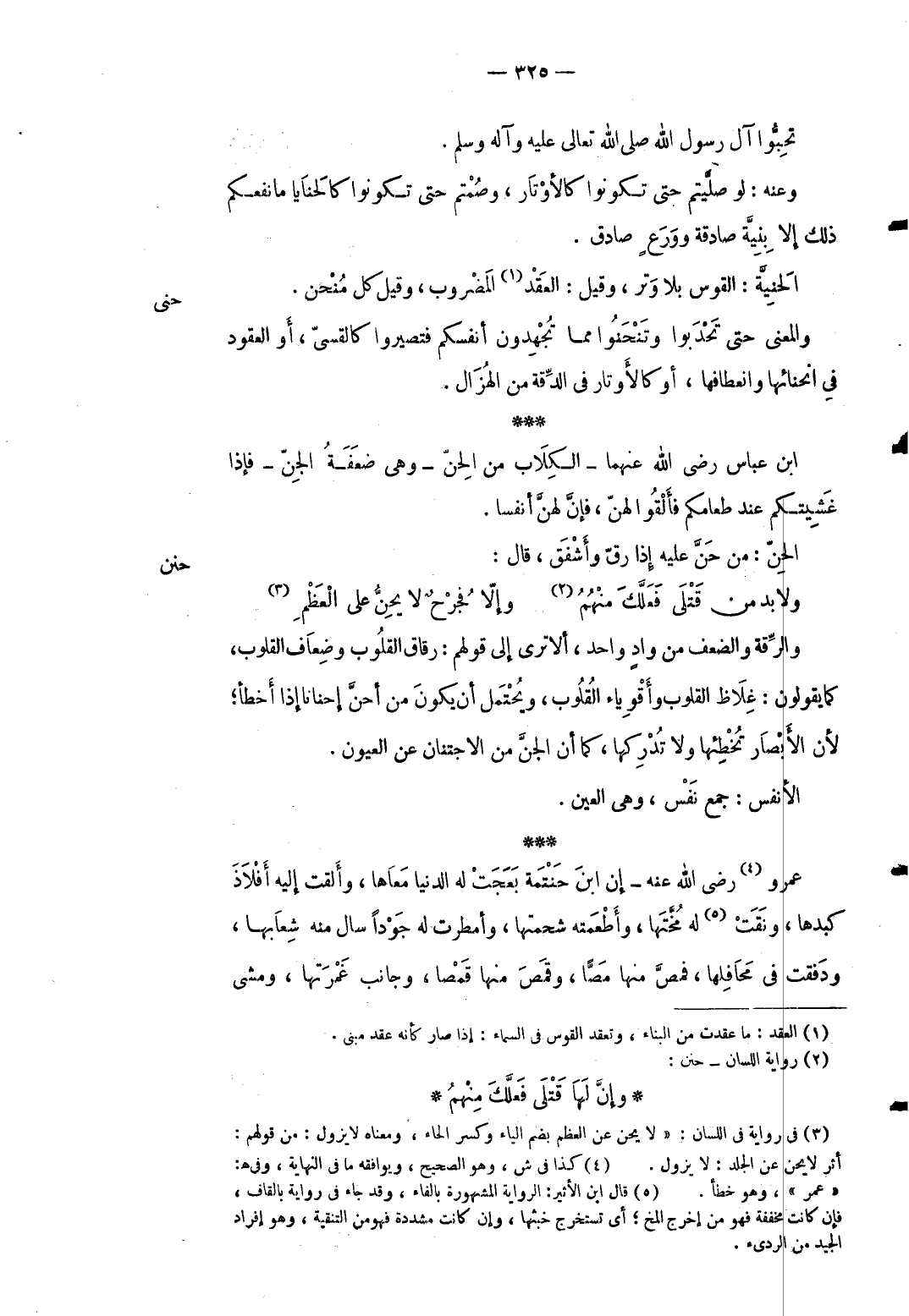 حنن الحن: من حن عَلَيْهِ إِذا رقّ وأشفق قَالَ: ... وَلَا بُد من قَتْلَى فَعَلَّكَ منْهُمُ ... وإلاّ فجُرْحٌ لَا يحِنُّ على العَظْمِ ... والرقة والضعف من وَاد وَاحِد أَلا ترى إِلَى قَوْلهم: رقاق الْقُلُوب وضعاف الْقُلُوب كَمَا يَقُولُونَ: غِلَاظ الْقُلُوب وأقوياء الْقُلُوب وَيحْتَمل أَن يكون من أحن إحنانا إِذا أَخطَأ لِأَن الْأَبْصَار تخطئها وَلَا تدركها كَمَا أَن الْجِنّ من الاجتنان عَن الْعُيُون. الْأَنْفس: جمع نفس وَهِي الْعين. عَمْرو رَضِي الله عَنهُ إِن ابْن حنتمة بعجت لَهُ الدُّنْيَا معاها وَأَلْقَتْ إِلَيْهِ أفلاذ كَبِدهَا ونقت لَهُ مخَّتها وَأَطْعَمته شحمتها وأمطرت لَهُ جوداً سَالَ مِنْهُ شعابها ودفقت فِي محافلها فمصَّ مِنْهَا مصَّاً وقمص مِنْهَا قمصا وجانب غمرتها وَمَشى