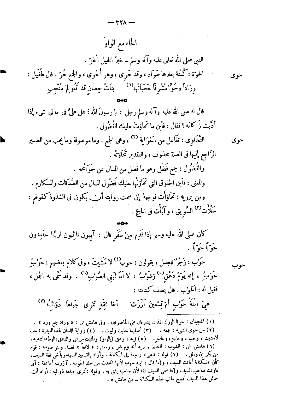 حوى التحاوي: تفَاعل من الحواية وَهِي الْجمع. وَمَا مَوْصُولَة وَمَا يجب من الضَّمِير الرَّاجِع إِلَيْهَا فِي الصِّلَة مَحْذُوف وَالتَّقْدِير تحاوته. والفضول: جمع فضل وَهُوَ مَا فضل من المَال عَن حَوَائِجه. وَالْمعْنَى: فَأَيْنَ الْحُقُوق الَّتِي تحاوتها عَلَيْك فضول المَال من الصَّدقَات والمكارم. وَمن يرويهِ: تحاوأت فوجهه إِن صحت رِوَايَته أَن يكون فِي الشذوذ كَقَوْلِهِم: حلأت السويق ولبأت فِي الْحَج. كَانَ صلى الله عَلَيْهِ وَسلم إِذا قدم من سفر قَالَ: آيبون تائبون لربنا حامدون حوبا حوبا.