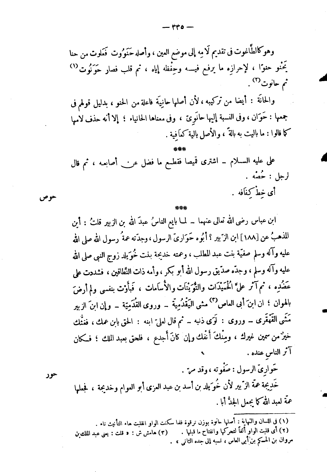 حور حوارِي الرَّسُول: صفوته وَقد مر. خَدِيجَة عمَّة الزبير لِأَن خويلد بن أَسد بن عبد الْعُزَّى أَبُو الْعَوام وَخَدِيجَة فَجَعلهَا عمَّة لعبد الله كَمَا يَجْعَل الْجد أَبَا.