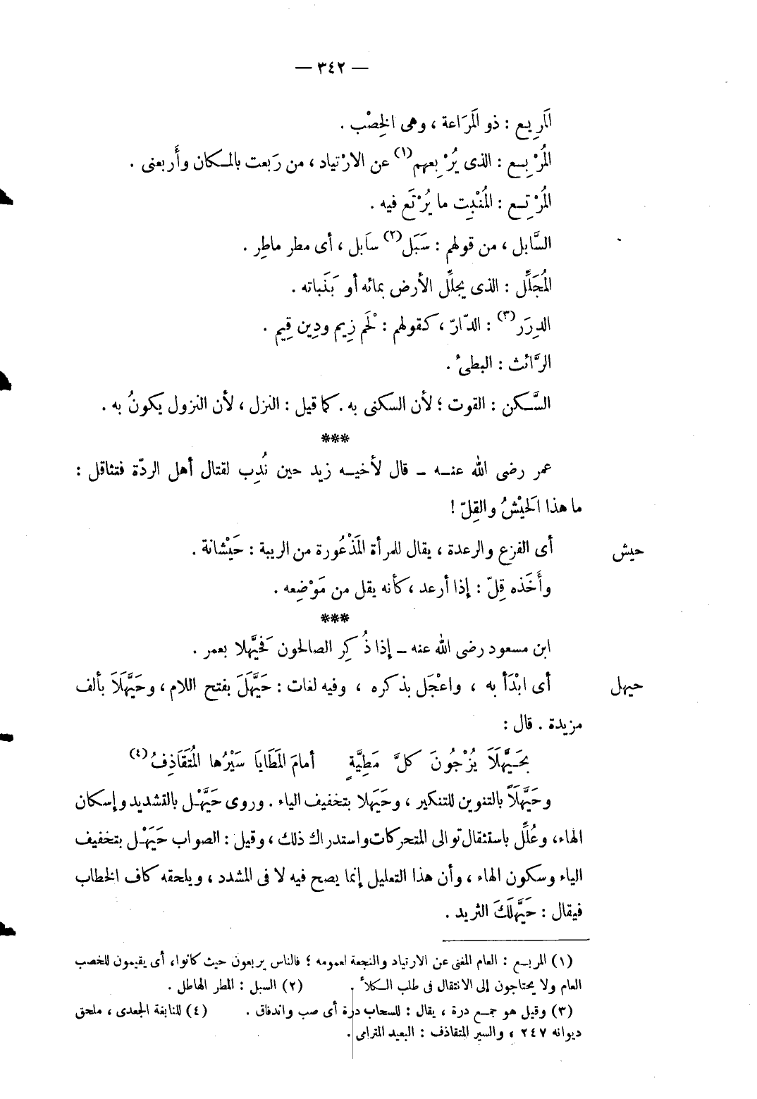 المريع: ذُو المراعة وَهِي الخصب المربع: الَّذِي يربعهم عَن الارتياد من ربعت بِالْمَكَانِ وأربعني. المرتع: المنبت مَا يرتع فِيهِ. السابل من قَوْلهم: سبل سابل أَي مطر ماطر. المجلل: الَّذِي يُجَلل الأَرْض بمائه أَو بنباته. الدُّرَر: الدَّار كَقَوْلِهِم: لحم زيم وَدين قيم. الرائث: البطيء. السكن: الْقُوت لِأَن السُّكْنَى بِهِ. كَمَا قيل: النزل لِأَن النُّزُول يكون بِهِ. عمر رَضِي الله عَنهُ قَالَ لِأَخِيهِ زيد حِين نُدب لقِتَال أهل الرِّدَّة فتثاقل: مَا هَذَا الحيش والقل