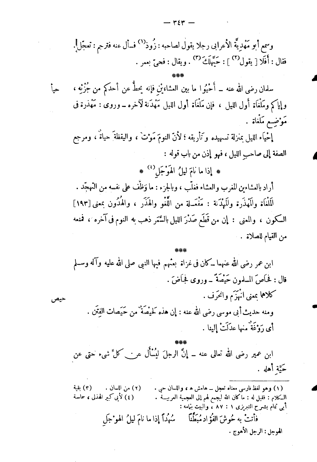 حيأ سلمَان رَضِي الله عَنهُ أحيوا مَا بَين العشاءين فَإِنَّهُ يحط عَن أحدكُم من جزئه وَإِيَّاكُم وملغاة أول اللَّيْل فَإِن ملغاة أول اللَّيْل مهدنة لآخره. وروى: مهذرة فِي مَوضِع ملغاة. إحْيَاء اللَّيْل بِمَنْزِلَة تسهيده وتأريقه لِأَن النّوم موت واليقظة حَيَاة ومرجع الصّفة إِلَى صَاحب اللَّيْل فَهُوَ إِذن من بَاب قَوْله: ... إِذا مَا نامَ ليلُ الهَوْجَلِ ... أَرَادَ بالعشاءين الْمغرب وَالْعشَاء فغلّب وبالجزء: مَا وظف على نَفسه من التَّهَجُّد. الملغاة والمهذرة والمهدنة: مفعلة من اللَّغْو والهذر والهدون بِمَعْنى [193] السّكُون وَالْمعْنَى: إِن من قطع صدر اللَّيْل بالسمر ذهب بِهِ النّوم فِي آخِره فَمَنعه من الْقيام للصَّلَاة. ابْن عمر رَضِي الله عَنْهُمَا كَانَ فِي غزَاة بَعثهمْ فِيهَا النَّبِي صلى الله تَعَالَى عَلَيْهِ وَآله وَسلم قَالَ: فَحَاص الْمُسلمُونَ حَيْصَة. وروى فجاض. كِلَاهُمَا بِمَعْنى انهزم وانحرف