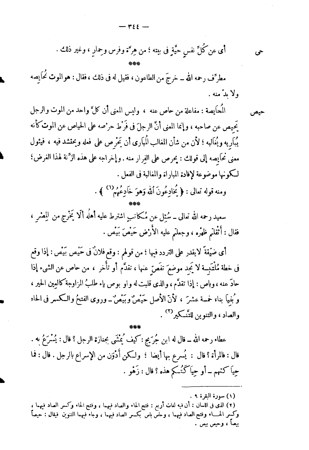 حيص المحايصة: مفاعلة من حَاص عَنهُ وَلَيْسَ الْمَعْنى أَن كل وَاحِد من الْمَوْت وَالرجل يحيص عَن صَاحبه وَإِنَّمَا الْمَعْنى أَن الرجل فِي فرط حرصه على الحياص عَن الْمَوْت كَأَنَّهُ يباريه ويغالبه لِأَن من شَأْن المغالب المباري أَن يحرص على فعله ويحتشد فِيهِ فيئول معنى نحايصه إِلَى قَوْلك: يحرص على الْفِرَار مِنْهُ. وإخراجه على هَذِه الزنة لهَذَا الْغَرَض لكَونهَا مَوْضُوعَة لإِفَادَة المباراة والمغالبة فِي الْفِعْل. وَمِنْه قَوْله تَعَالَى: {يُخادِعُونَ الله وَهوَ خَادِعُهُم} . سعيد رَحمَه الله تَعَالَى سُئل عَن مكَاتب اشْتِرَاط عَلَيْهِ أَهله أَلا يخرج من الْمصر فَقَالَ: أثقلتم ظَهره وجعلتم عَلَيْهِ الأَرْض حيص بيص. أَي ضيقَة لَا يقدر على التَّرَدُّد فِيهَا من قَوْلهم: وَقع فلَان فِي حيص بيص: إِذا وَقع فِي خطة ملتبسة لَا يجد مَوضِع تفصٍّ عَنْهَا تقدم أَو تَأَخّر من حَاص عَن الشىء إِذا حاد عَنهُ وباص: إِذا تقدم وَالَّذِي قلبت لَهُ وَاو بوص يَاء طلب المزاوجة كَالْعَيْنِ الحير وَنَبِيًّا بناءَ خَمْسَة عشر لِأَن الأَصْل حيص وبيص. وروى الْفَتْح وَالْكَسْر فِي الْحَاء وَالصَّاد والتنوين للتنكير. عَطاء رَحمَه الله قَالَ ابْن جريج: كَيفَ يمشي بِجنَازَة الرجل قَالَ: يُسرع بِهِ. قَالَ: فالمرأة قَالَ: يُسرع بهَا أَيْضا وَلَكِن أدون من الْإِسْرَاع بِالرجلِ. قَالَ: فَمَا حياكتهم أَو حياكتكم قَالَ: زهو.