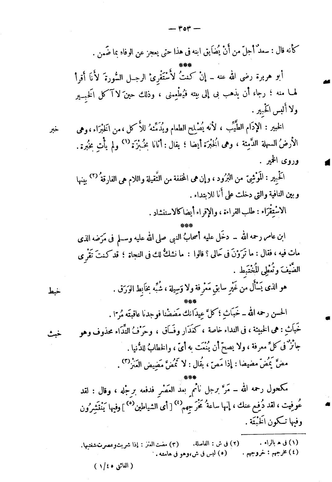 خبر الْخَبِير: الإدام الطّيب لِأَنَّهُ يصلح الطَّعَام ويدمثه للْأَكْل من الخبراء وَهِي الأَرْض السهلة الدمثة وَهِي الْخِبْرَة أَيْضا يُقَال: أَتَانَا بخبزة وَلم يَأْتِ بخبرة. وروى الخمير. الحبير: الْمُوشى من البرود وَإِن هِيَ المخففة من الثَّقِيلَة وَاللَّام هِيَ الفارقة بَينهَا وَبَين النافية وَالَّتِي دخلت على أَنا للابتداء. الاستقراء: طلب الْقِرَاءَة والإقراء أَيْضا كالاستنشاد. ابْن عَامر رَحمَه الله دخل عَلَيْهِ أَصْحَاب النَّبِي صلى الله عَلَيْهِ وَسلم فِي مَرضه الَّذِي مَاتَ فِيهِ فَقَالَ: مَا ترَوْنَ فِي حَالي قَالُوا: مَا نشك لَك فِي النجَاة قد كنت تقري الضَّيْف وَتُعْطِي المختبط.