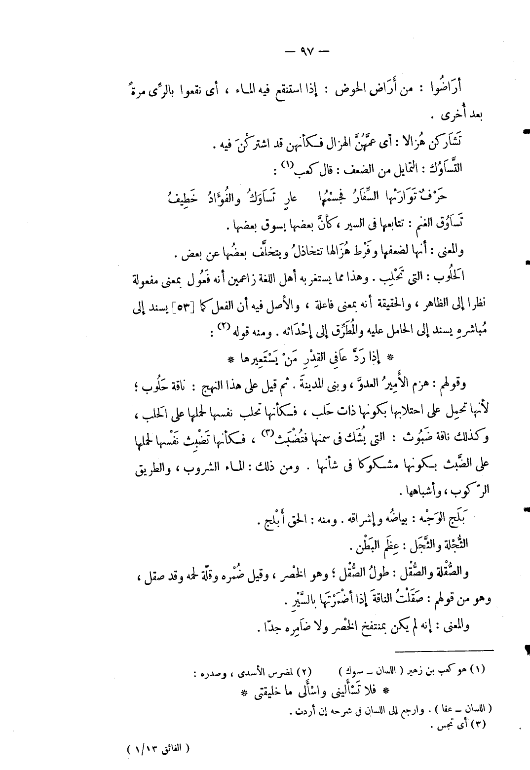 أرضوا من أراض الْحَوْض إِذا استنقع فِيهِ المَاء أَي نقعوا بِالريِّ مرّة بعد أُخْرَى. تشاركن هزالًا أَي عمهن الهزال فكأنهن قد اشتركن فِيهِ. التساوك التمايل من الضعْف قَالَ كَعْب ... حَرْفٌ تَوَارَثها السِّفارُ فجسْمُها ... عارٍ تَسَاوَكُ والفُؤَادُ خَطِيفُ ... تساوق الْغنم تتابعها فِي السّير كَأَن بَعْضهَا يَسُوق بَعْضهَا. وَالْمعْنَى أَنَّهَا لِضعْفِهَا وفرط هزالها تتخاذل ويتخلف بَعْضهَا عَن بعض. الحلوب الَّتِي تحلب. وَهَذَا مِمَّا يستغربه أهل اللُّغَة زاعمين أَنه فعول بِمَعْنى مفعولة نظرا إِلَى الظَّاهِر والحقيقة أَنه بِمَعْنى فاعلة وَالْأَصْل فِيهِ أَن الْفِعْل كَمَا يسند إِلَى مباشره يسند إِلَى الْحَامِل عَلَيْهِ والمطرق إِلَى إحداثه. وَمِنْه قَوْله ... إِذا رَدَّ عَافىِ القِدْرِ مَنْ يَسْتَعِيرها ... . وَقَوْلهمْ هزم الْأَمِير الْعَدو وَبني الْمَدِينَة. ثمَّ قيل على هَذَا النهج نَاقَة حَلُوب لِأَنَّهَا تحمل على احتلابها بِكَوْنِهَا ذَات حلب فَكَأَنَّهَا تحلب نَفسهَا لحملها على الْحَلب وَكَذَلِكَ نَاقَة ضبوث الَّتِي تشك فِي سمنها فتضبث فَكَأَنَّهَا تضبث نَفسهَا لحملها على الضبث بِكَوْنِهَا مشكوكا فِي شَأْنهَا. وَمن ذَلِك المَاء الشروب وَالطَّرِيق الرّكُوب واشباهها. بلج الْوَجْه بياضه وإشراقه. وَمِنْه الْحق أَبْلَج. الثجلة والثجل عظم الْبَطن. والصقلة والصقل طول الصقل وَهُوَ الخصر وَقيل ضمره وَقلة لَحْمه وَقد صقل وَهُوَ من قَوْلهم صقلت النَّاقة إِذا أضمرتها بالسير. وَالْمعْنَى إِنَّه لم يكن بمنتفخ الخصر وَلَا ضامره جدا.