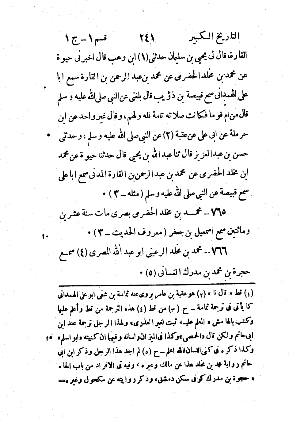 765 - مُحَمَّد بْن مخلد الحضرمي بصري مات سنة عشرين ومائتين سمع اسمعيل بْن جَعْفَر (مَعْروف الحديث - 3) .