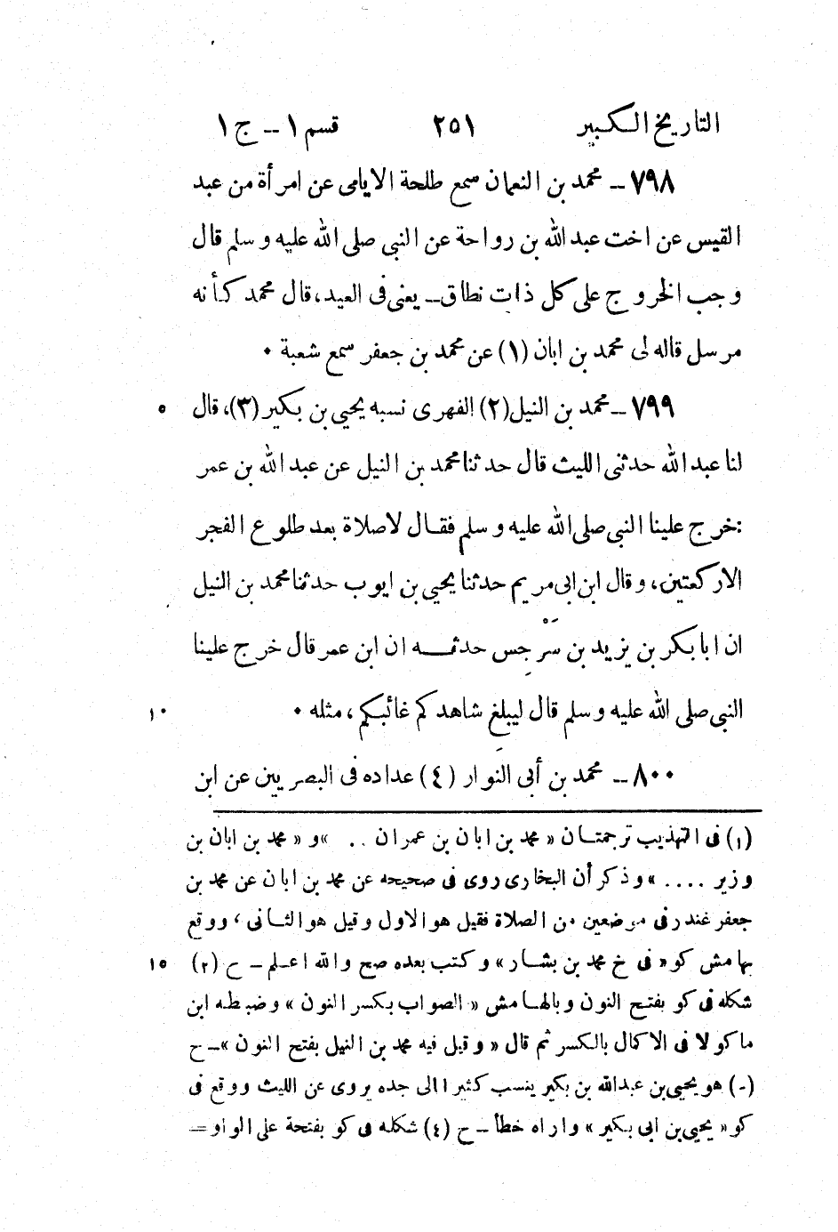 799 - مُحَمَّد بْن النيل (2) الفهري نسبه يحيى بْن بكير (3) ، قَالَ لَنَا عَبْدُ اللَّهِ حَدَّثَنِي اللَّيْثُ قَالَ حَدَّثَنَا مُحَمَّدُ بْنُ النِّيلِ عَنْ عَبْدِ اللَّهِ بْنِ عُمَرَ: خَرَجَ عَلَيْنَا النَّبِيُّ صَلَّى اللَّهُ عَلَيْهِ وَسَلَّمَ فَقَالَ لا صَلاةَ بَعْدَ طُلُوعِ الْفَجْرِ إِلا رَكْعَتَيْنِ، وقَالَ ابْن أَبِي مريم حَدَّثَنَا يَحْيَى بْن أيوب حَدَّثَنَا مُحَمَّد بْن النيل أن أبا بكر بن يزيد بن سرجس حدثه أن ابْن عُمَر قَالَ خَرَجَ عَلَيْنَا النَّبِيّ صَلَّى اللَّهُ عَلَيْهِ وَسَلَّمَ قَالَ ليبلغ شاهدكم غائبكم، مثلَهُ.