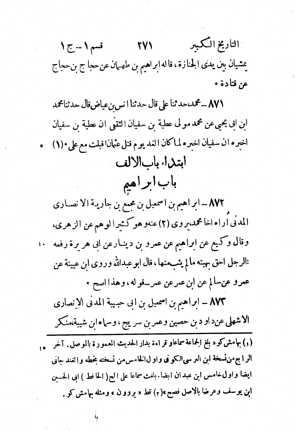 872 - ابراهيم بن اسمعيل بْن مجمع بْن جارية الْأَنْصَارِيّ الْمَدَنِيّ أراه أخا مُحَمَّد، يروي (2) عَنْهُ وهو كثير الوهم عَنِ الزُّهْرِيّ، وقَالَ وكيع عَنْ إِبْرَاهِيم عَنْ عَمْرو بْن دينار عَنْ أَبِي هُرَيْرَةَ رفعه: الرجل أحق بِهِبَتِهِ ما لم يثب منها، قَالَ أَبُو عَبْد اللَّه وروى ابْن عيينة عَنْ عَمْرو عَنْ سالم عَنِ ابْن عُمَر عَنْ عُمَر - قوله، وهذا أصح.