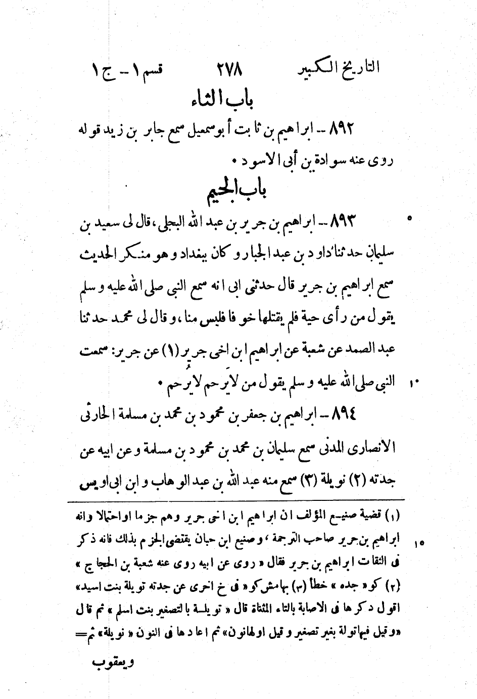 (1) قضية صنيع المؤلف ان ابراهيم ابن اخى جرير وهم جزما أو احتمالا وانه ابراهيم بن جرير صاحب الترجمة، وصنيع ابن حبان يقتضى الجزم بذلك فانه ذكر في الثقات ابراهيم بن جرير فقال " روى عن ابيه روى عنه شعبة بن الحجاج " (2) كو " جده " خطأ (3) بهامش كو " في خ اخرى عن جدته تويلة بنت اسيد " اقول ذكرها في الاصابة بالتاء المثناة قال " تويلة بالتصغير بنت اسلم " ثم قال " وقيل فيها تولة بغير تصغير وقيل اولها نون " ثم اعادها في النون " نويلة " ثم = (*)