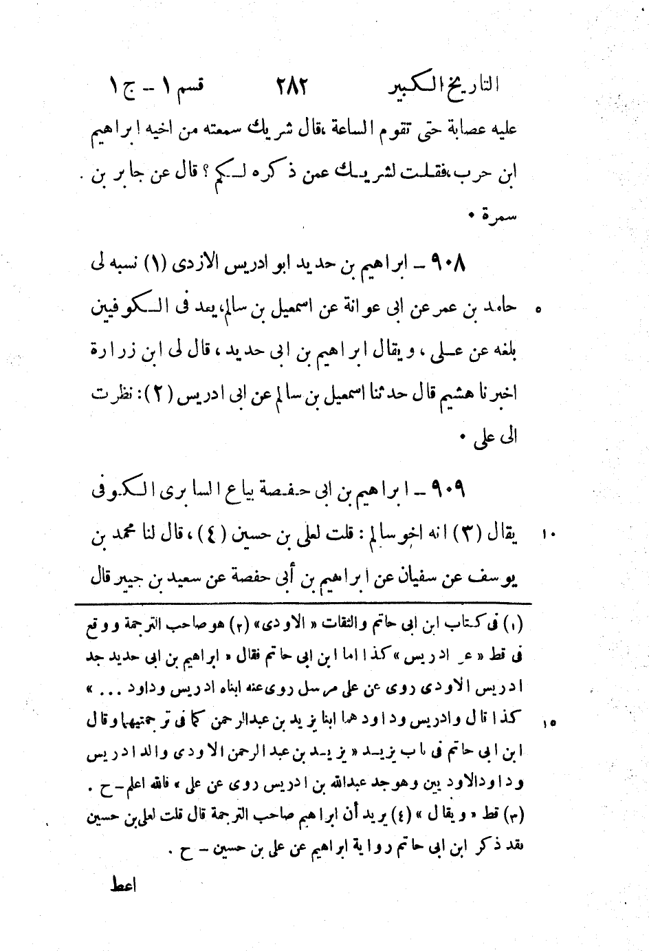 909 - إِبْرَاهِيم بْن أَبِي حفصة بياع السابري الكوفِي يقال (3) أَنَّهُ أخو سالم: قلت لعلي بْن حسين (4) ، قَالَ لنا مُحَمَّد بْن