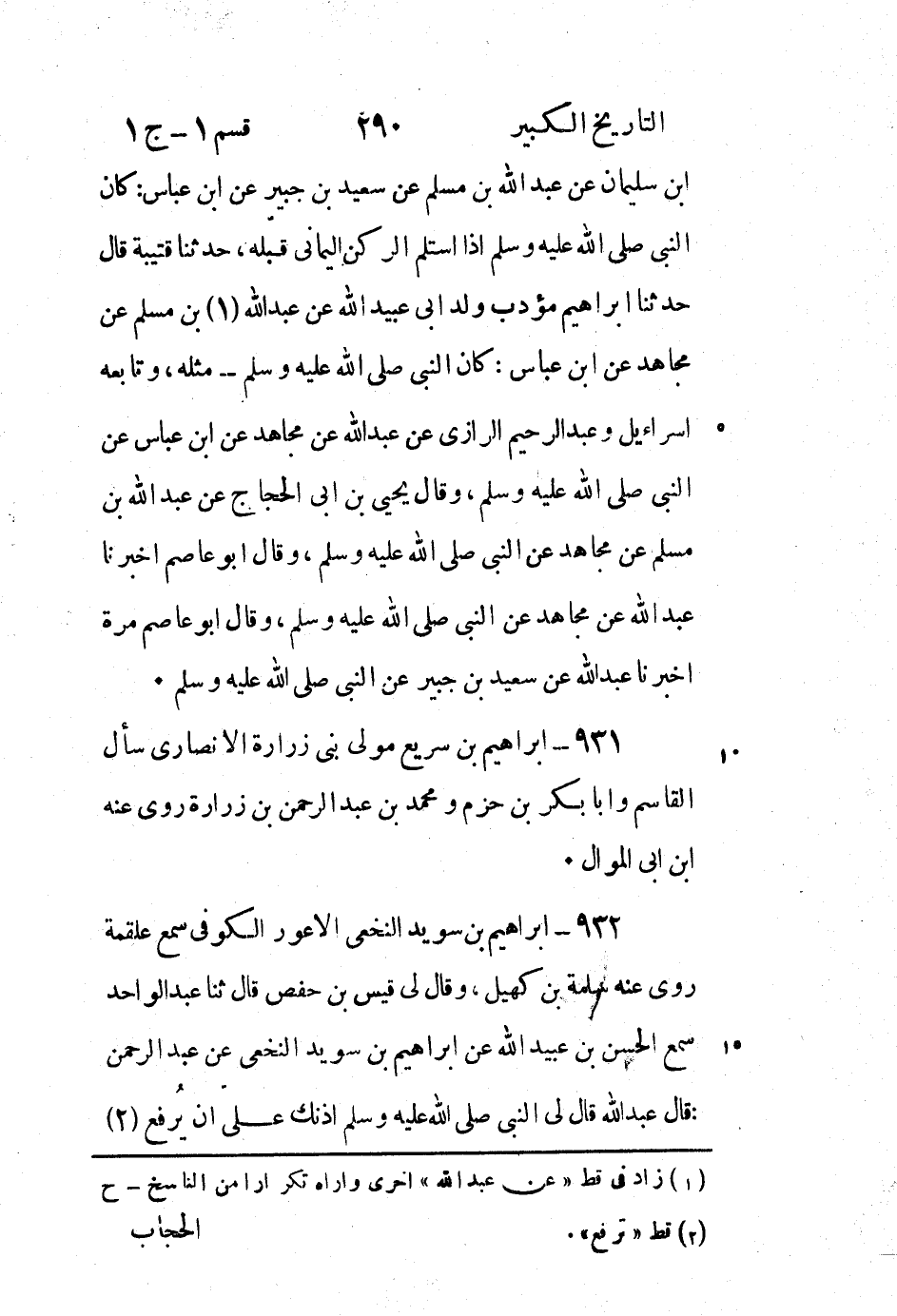 ابن سُلَيْمَانَ عَنْ عَبْدِ اللَّهِ بْنِ مُسْلِم عَنْ سَعِيدِ بْنِ جُبَيْر عَنِ ابْنِ عَبَّاسٍ: كَانَ النَّبِيُّ صَلَّى اللَّهُ عَلَيْهِ وَسَلَّمَ إِذَا اسْتَلَمَ الرُّكْنَ الْيَمَانِيَّ قَبَّلَهُ، حَدَّثَنَا قُتَيْبَةُ قَالَ حَدَّثَنَا ابراهيم مؤدب ولد ابى عبيد الله عن عبد الله (1) بن مسلم عن مجاهد عَنِ ابْن عَبَّاس: كَانَ النَّبِيّ صَلَّى اللَّهُ عَلَيْهِ وَسَلَّمَ - مِثْلَهُ، وَتَابَعَهُ اسراءيل وَعَبْدُ الرَّحِيمِ الرَّازِيُّ عَنْ عَبْدِ اللَّهِ عَنْ مُجَاهِدٍ عَنِ ابْنِ عَبَّاسٍ عَنِ النَّبِيِّ صَلَّى اللَّهُ عَلَيْهِ وَسَلَّمَ، وقَالَ يحيى بْن أَبِي الحجاج عَنْ عَبْد اللَّه بْن مُسْلِم عَنْ مجاهد عَنِ النَّبِيِّ صَلَّى اللَّهُ عَلَيْهِ وَسَلَّمَ، وقَالَ أَبُو عاصم أَخْبَرَنَا