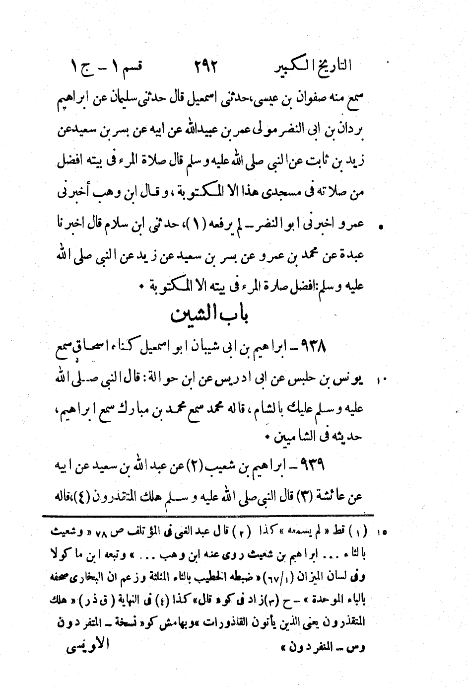 (1) قط " لم يسمعه " كذا (2) قال عبد الغنى في المؤتلف ص 78 " وشعيث بالثاء..ابراهيم بن شعيث روى عنه ابن وهب.." وتبعه ابن ماكولا وفى لسان الميزان (1 / 67) " ضبطه الخطيب بالثاء المثلثة وزعم ان البخاري صحفه بالباء الموحدة " - ح (3) زاد في كو " قال " كذا (4) في النهاية (ق ذ ر) " هلك المتقذرون يعنى الذين يأتون القاذورات " وبهامش كو " نسخة - المتفردون وس - المنفردون " (*)
