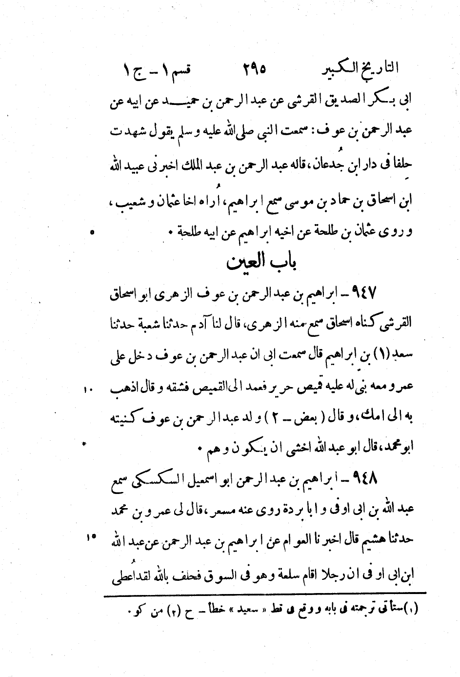 947 - إِبْرَاهِيم بْن عَبْد الرَّحْمَن بْن عوف الزُّهْرِيّ أَبُو إِسْحَاق الْقُرَشِيّ كناه إِسْحَاق سَمِعَ منه الزُّهْرِيّ، قَالَ لَنَا آدَمُ حَدَّثَنَا شُعْبَةُ حَدَّثَنَا سَعْدُ (1) بْنُ إِبْرَاهِيمَ قَالَ سَمِعْتُ أَبِي أَنَّ عَبْدَ الرَّحْمَنِ بْنَ عَوْفٍ دَخَلَ عَلَى عُمَرَ وَمَعَهُ بُنَيٌّ لَهُ عَلَيْهِ قَمِيصٌ حَرِيرٌ فَعَمَدَ إِلَى الْقَمِيصِ فَشَقَّهُ وَقَالَ اذْهَبْ بِهِ إِلَى أُمِّكَ، وقَالَ (بعض - 2) ولد عَبْد الرَّحْمَن بْن عوف كنيته أَبُو مُحَمَّد، قَالَ أَبُو عَبْد اللَّه أخشى أن يكون وهم.