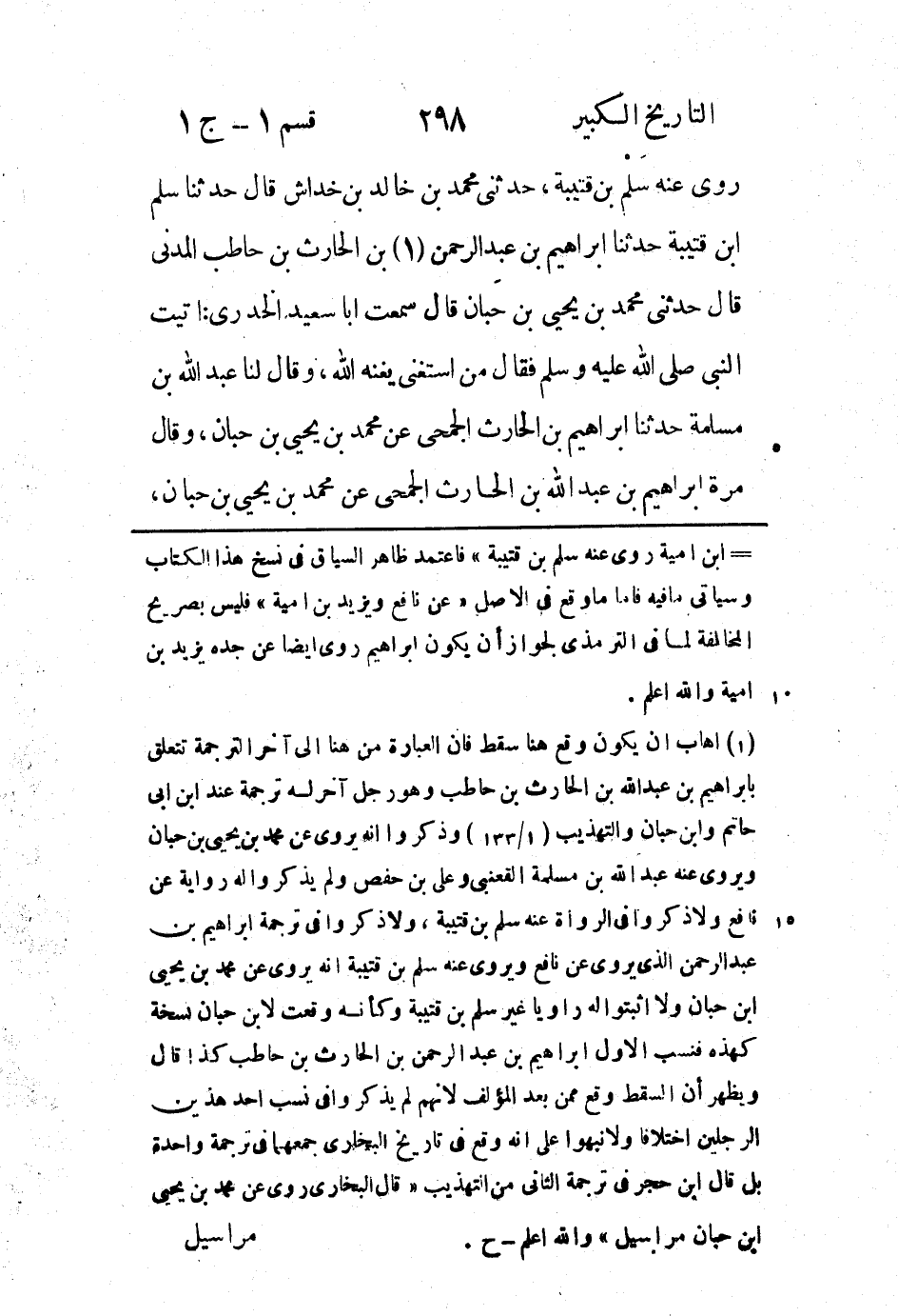 (1) اهاب ان يكون وقع هنا سقط فان العبارة من هنا إلى آخر الترجمة تتعلق بابراهيم بْن عَبْد الله بن الحارث بن حاطب وهو رجل آخر له ترجمة عند ابن ابى حاتم وابن حبان والتهذيب (1 / 133) وذكروا انه يروى عن محمد بن يحيى بن حبان ويروى عنه عبد الله بن مسلمة القعنبى وعلى بن حفص ولم يذكروا له رواية عن نافع ولا ذكروا في الرواة عنه سلم بن قتيبة، ولا ذكروا في ترجمة ابراهيم بن عبد الرحمن الذى يروى عن نافع ويروى عنه سلم بن قتيبة انه يروى عن محمد بن يحيى ابن حبان ولا اثبتوا له راويا غير سلم بن قتيبة وكأنه وقعت لابن حبان نسخة كهذه فنسب الاول ابراهيم بن عبد الرحمن بن الحارث بن حاطب كذا قال ويظهر أن السقط وقع ممن بعد المؤلف لانهم لم يذكروا في نسب احد هذين الرجلين اختلافا ولا نبهوا على انه وقع في تاريخ البخاري جمعهما في ترجمة واحدة بل قال ابن حجر في ترجمة الثاني من التهذيب " قال البخاري روى عن محمد بن يحيى ابن حبان مراسيل " والله اعلم - ح.