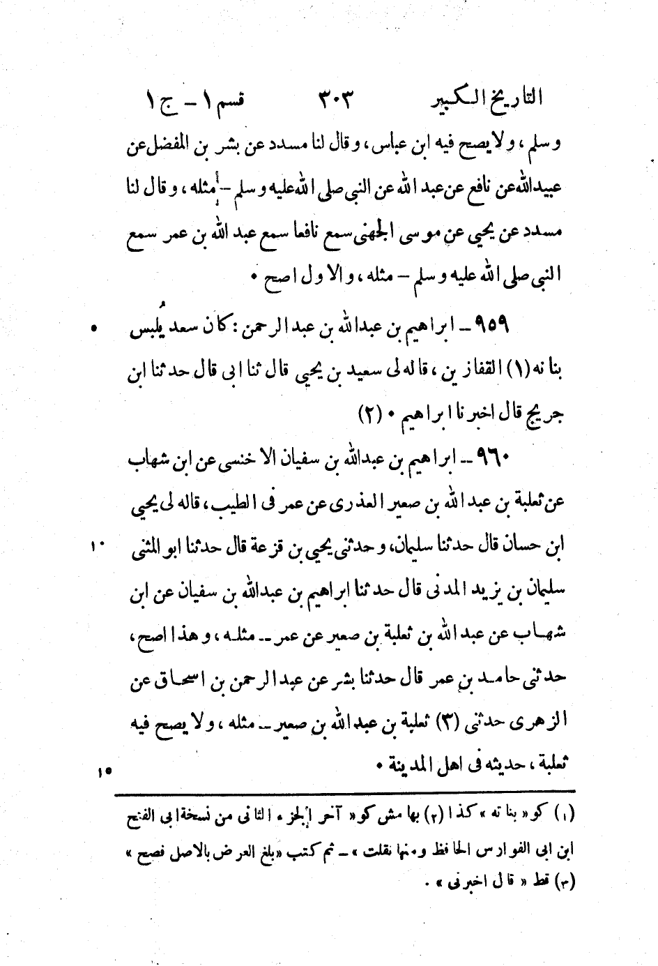 959 - إِبْرَاهِيم بْن عَبْد اللَّه بْن عَبْد الرَّحْمَن: كَانَ سعد يلبس بنانه (1) القفازين، قَالَه لي سَعِيد بْن يَحْيَى قَالَ ثنا أَبِي قَالَ حَدَّثَنَا ابن جريح قَالَ أَخْبَرَنَا إِبْرَاهِيم.