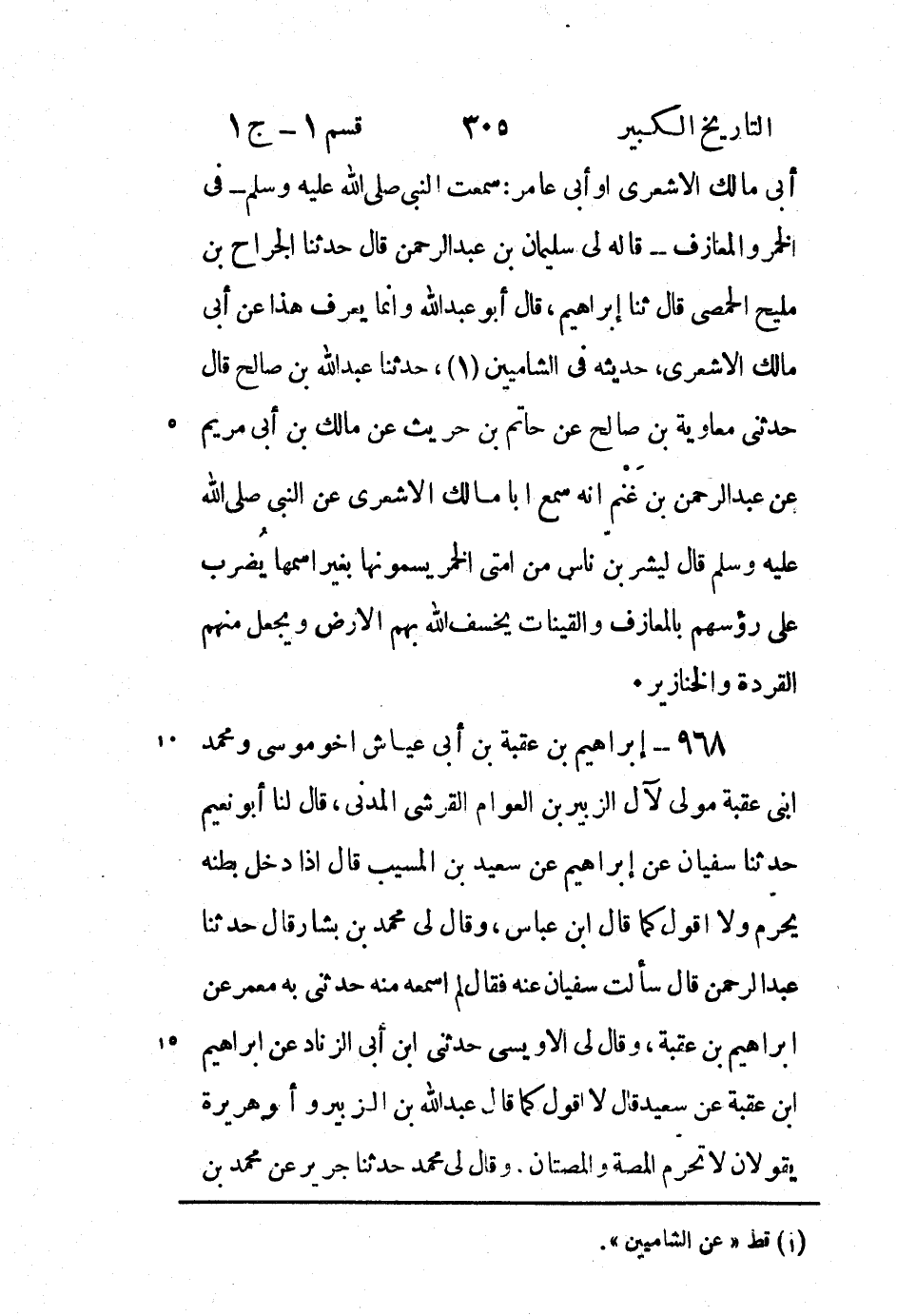 أَبِي مَالِكٍ الأَشْعَرِيِّ أَوْ أَبِي عَامِرٍ: سَمِعْتَ النَّبِيَّ صَلَّى اللَّهُ عَلَيْهِ وَسَلَّمَ - فِي الْخَمْرِ وَالْمَعَازِفِ - قَالَهُ لِي سُلَيْمَانُ بْنُ عَبْدِ الرَّحْمَن قَالَ حَدَّثَنَا الْجَرَّاحُ بْنُ مَلِيحٍ الْحِمْصِيُّ قَالَ ثنا إِبْرَاهِيمُ، قَالَ أَبُو عَبْد اللَّه وإنما يعرف هذا عَنْ أَبِي مالك الأشعري، حديثه فِي الشاميين (1) ، حَدَّثَنَا عَبْدُ اللَّهِ بْنُ صَالِحٍ قَالَ حَدَّثَنِي مُعَاوِيَةُ بْنُ صَالِحٍ عَنْ حَاتِمِ بْنِ حُرَيْثٍ عَنْ مَالِكِ بْنِ أَبِي مَرْيَمَ عَنْ عَبْدِ الرَّحْمَن بْنِ غَنَمٍ أَنَّهُ سَمِعَ أَبَا مَالِكٍ الأَشْعَرِيَّ عَنِ النَّبِيِّ صَلَّى اللَّهُ عَلَيْهِ وَسَلَّمَ قَالَ ليشربن نَاسٌ مِنْ أُمَّتِي الْخَمْرَ يُسَمُّونَهَا بِغَيْرِ اسْمِهَا يُضْرَبُ على رؤسهم بِالْمَعَازِفِ وَالْقَيْنَاتِ يَخْسِفُ اللَّهُ بِهِمُ الأَرْضَ وَيَجْعَلُ مِنْهُمُ الْقِرَدَةَ وَالْخَنَازِيرَ.