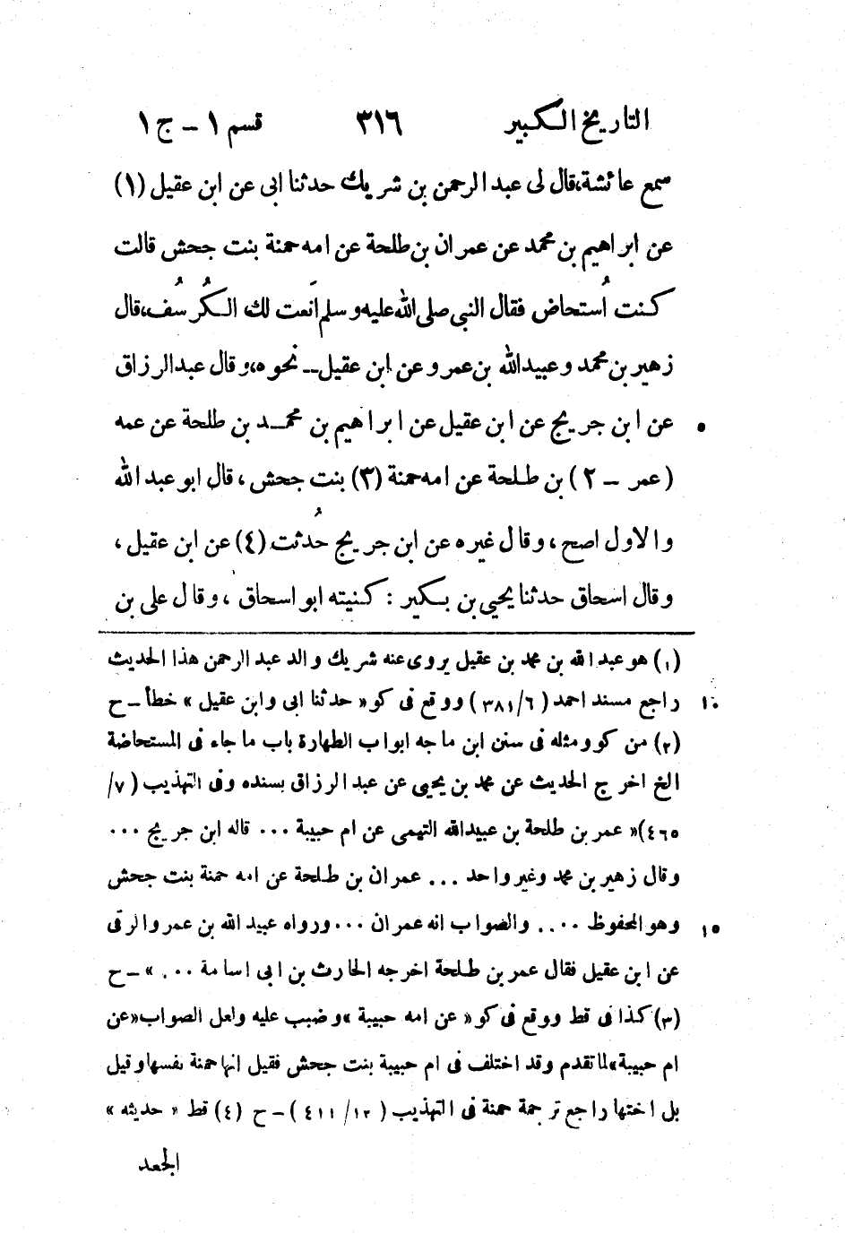 (1) هو عبد الله بن محمد بن عقيل يروى عنه شريك والد عبد الرحمن هذا الحديث راجع مسند احمد (6 / 381) ووقع في كو " حدثنا ابى وابن عقيل " خطأ - ح (2) من كو ومثله في سنن ابن ماجه ابواب الطهارة باب ما جاء في المستحاضة الخ اخرج الحديث عن محمد بن يحيى عن عبد الرزاق بسنده وفى التهذيب (7 / 465) " عمر بن طلحة بن عبيد الله التيمى عن ام حبيبة..قاله ابن جريج..وقال زهير بن محمد وغير واحد..عِمْرَانَ بْنِ طَلْحَةَ عَنْ أُمِّهِ حَمْنَةَ بِنْتِ جحش وهو المحفوظ..والصواب انه عمران..ورواه عبيد الله بن عمرو الرقى عن ابن عقيل فقال عمر بن طلحة اخرجه الحارث بن ابى اسامة.." - ح (3) كذا في قط ووقع في كو " عن امه حبيبة " وضبب عليه ولعل الصواب " عن ام حبيبة " لما تقدم وقد اختلف في ام حبيبة بنت جحش فقيل انها حمنة نفسها وقيل بل اختها راجع ترجمة حمنة في التهذيب (13 / 411) - ح (4) قط " حديثه " (*)
