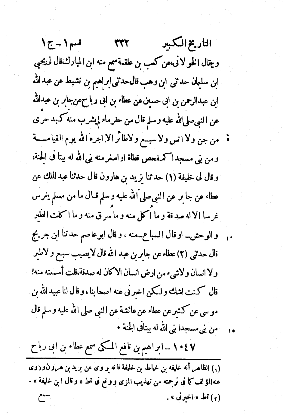 ابن عَبْدِ الرَّحْمَنِ بْنِ أَبِي حُسَيْنٍ عَنْ عَطَاءِ بْنِ أَبِي رَبَاحٍ عَنْ جَابِر بْنِ عَبْدِ اللَّهِ عَنِ النَّبِيِّ صَلَّى اللَّهُ عَلَيْهِ وَسَلَّمَ قَالَ مَنْ حَفَرَ مَاءً لَمْ يَشْرَبْ مِنْهُ كَبِدٌ حَرَّى مِنْ جِنٍّ وَلا إِنْسٍ وَلا سَبُعٍ وَلا طَائِرٍ إِلا آجَرَهُ اللَّهُ يَوْمَ الْقِيَامَةِ وَمَنْ بَنَى مَسْجِدًا كَمَفْحَصِ قَطَاةٍ أَوْ أَصْغَرَ مِنْهُ بَنَى اللَّهُ لَهُ بَيْتًا فِي الْجَنَّةِ، وَقَالَ لِي خَلِيفَةُ (1) حَدَّثَنَا يَزِيدُ بْنُ هَارُونَ قَالَ حَدَّثَنَا عَبْدُ الْمَلِكِ عَنْ عَطَاءٍ عَنْ جَابِر عَنِ النَّبِيِّ صَلَّى اللَّهُ عَلَيْهِ وَسَلَّمَ قَالَ مَا مِنْ مُسْلِمٍ يَغْرِسُ غَرْسًا إِلا لَهُ صَدَقَةٌ وَمَا أَكَلَ مِنْهُ وَمَا سُرِقَ مِنْهُ وَمَا أَكَلَتِ الطَّيْرُ وَالْوَحْشُ - أَوْ قَالَ السِّبَاعُ - مِنْهُ، وقَالَ أَبُو عاصم حَدَّثَنَا ابْن جريج قَالَ حدثني (2) عَطَاءٍ عَنْ جَابِرِ بْنِ عَبْدِ اللَّهِ قَالَ لا يصيب سبع ولا طير ولا انسان ولا شئ من أرض إنسان إلا كَانَ لَهُ صدقة، قلت أسمعته منه؟ قَالَ كنت أشك ولكن اخبرني عنه اصحابنا، وقال لنا عبيد الله بْنُ مُوسَى عَنْ كَثِيرٍ عَنْ عَطَاءٍ عَنْ عَائِشَةَ عَنِ النَّبِيِّ صَلَّى اللَّهُ عَلَيْهِ وَسَلَّمَ قَالَ مَنْ بَنَى مَسْجِدًا بَنَى اللَّهُ لَهُ بَيْتًا فِي الْجَنَّةِ.