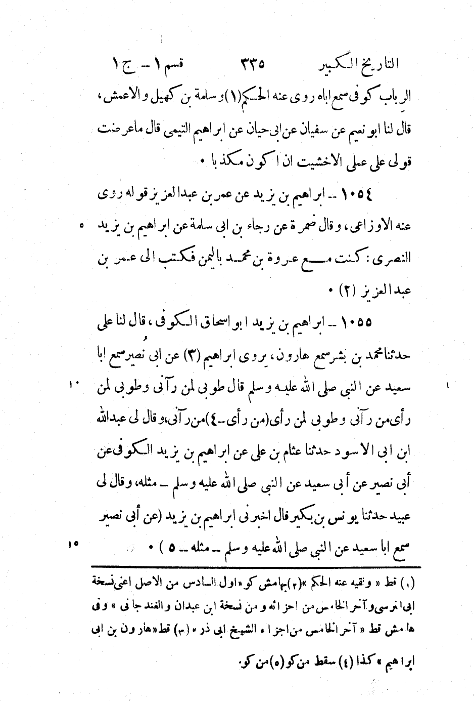 1055 - إِبْرَاهِيم بْن يزيد أَبُو إِسْحَاق الكوفِي، قَالَ لَنَا عَلِيٌّ حَدَّثَنَا مُحَمَّدُ بْنُ بِشْرٍ سمع هارون، يروى إِبْرَاهِيمَ (3) عَنْ أَبِي نُصَيْرٍ سَمِعَ أَبَا سَعِيد عَنِ النَّبِيِّ صَلَّى اللَّهُ عَلَيْهِ وَسَلَّمَ قَالَ طُوبَى لِمَنْ رَآنِي وَطُوبَى لِمَنْ