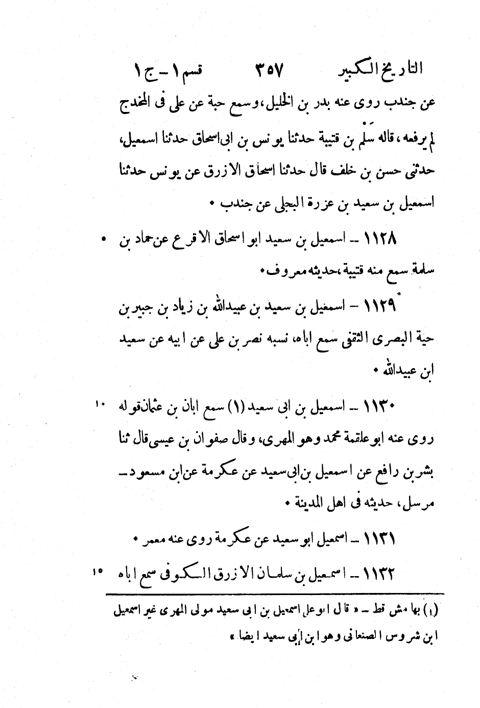 1130 - اسمعيل بْن أَبِي سَعِيد (1) سَمِعَ أبان بْن عثمان قولَهُ روى عَنْهُ أَبُو علقمة مُحَمَّد وهو المهري، وقَالَ صفوان بْن عيسى قَالَ ثنا بشر بن رافع عن اسمعيل بْن أَبِي سَعِيد عَنْ عكرمة عَنِ ابْن مسعود - مرسل، حديثه في اهل المدينة.