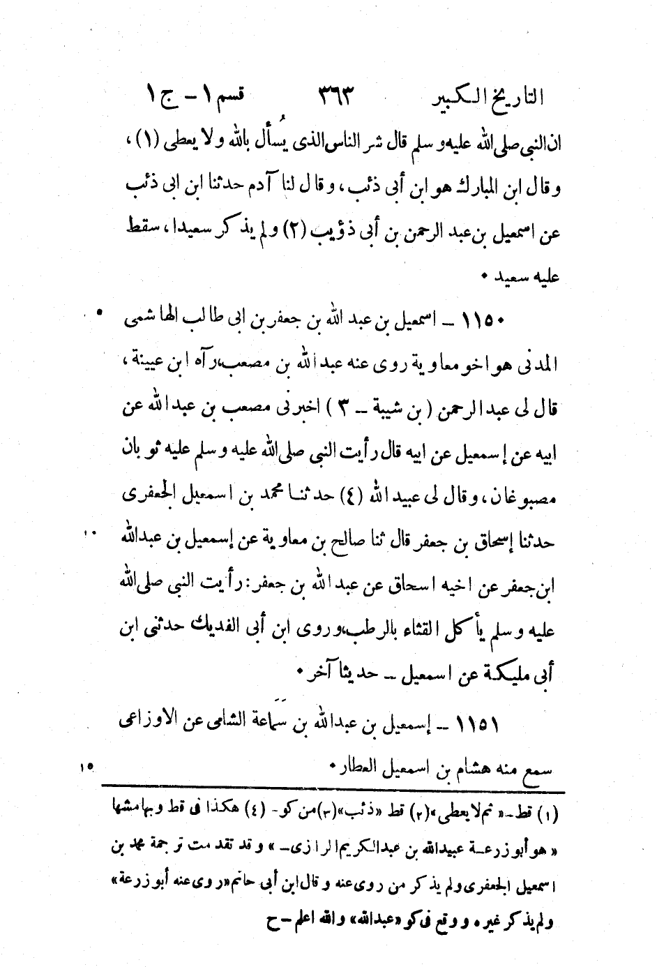 (1) قط " ثم لا يعطى " (2) قط " ذئب " (3) من كو (4) هكذا في قط وبهامشها " هو أبو زرعة عبيد الله بن عبد الكريم الرازي - " وقد تقدمت ترجمة محمد بن اسمعيل الجعفري ولم يذكر من روى عنه وقال ابن أبى حاتم " روى عنه أبو زرعة " ولم يذكر غيره ووقع في كو " عبد الله " والله اعلم - ح (*)